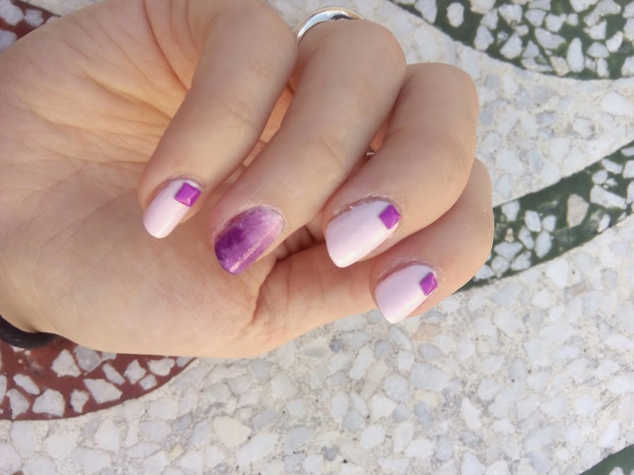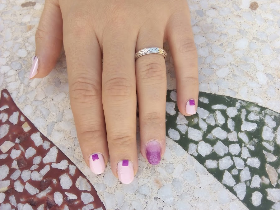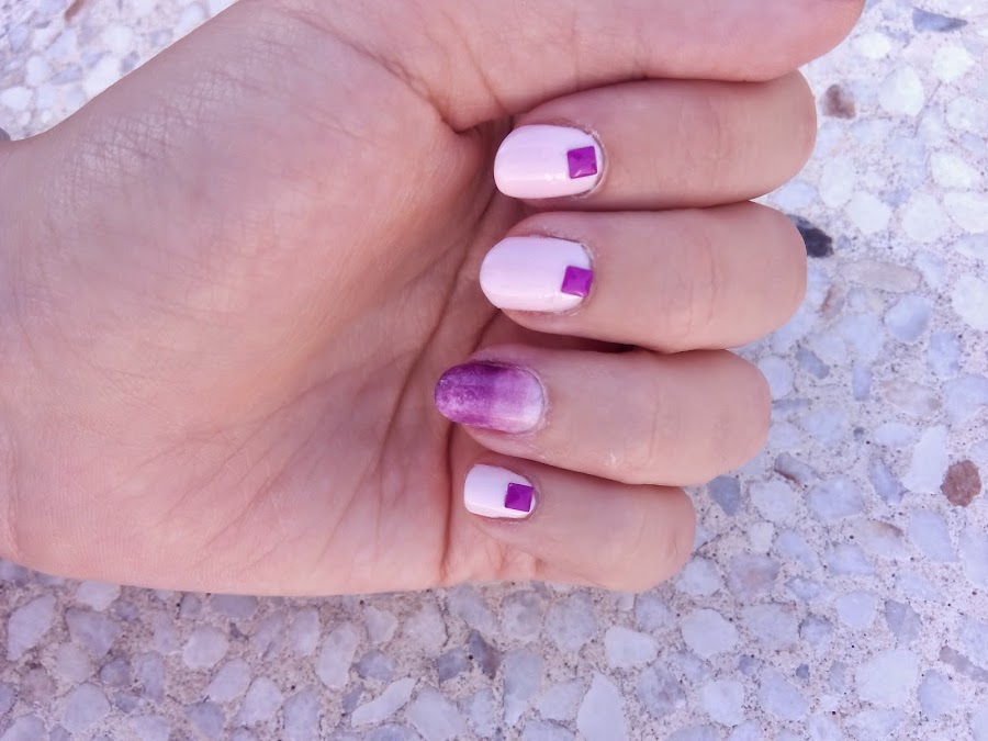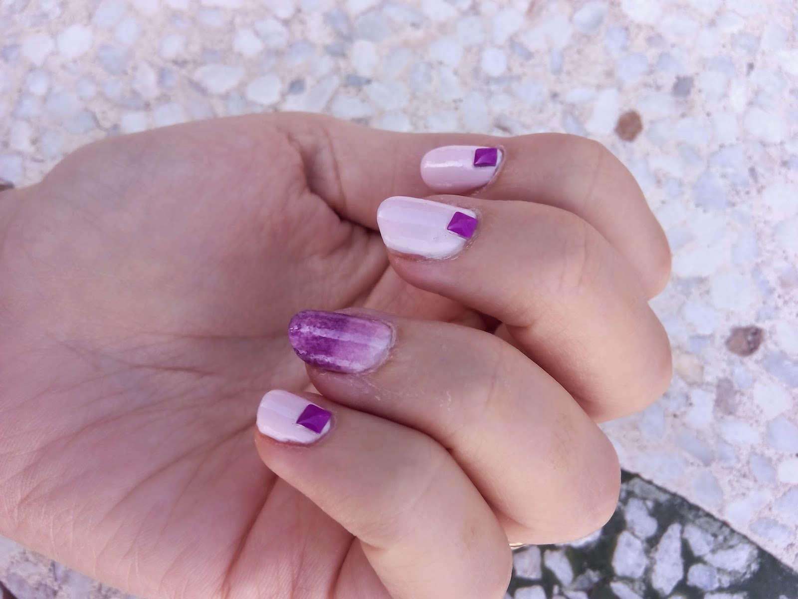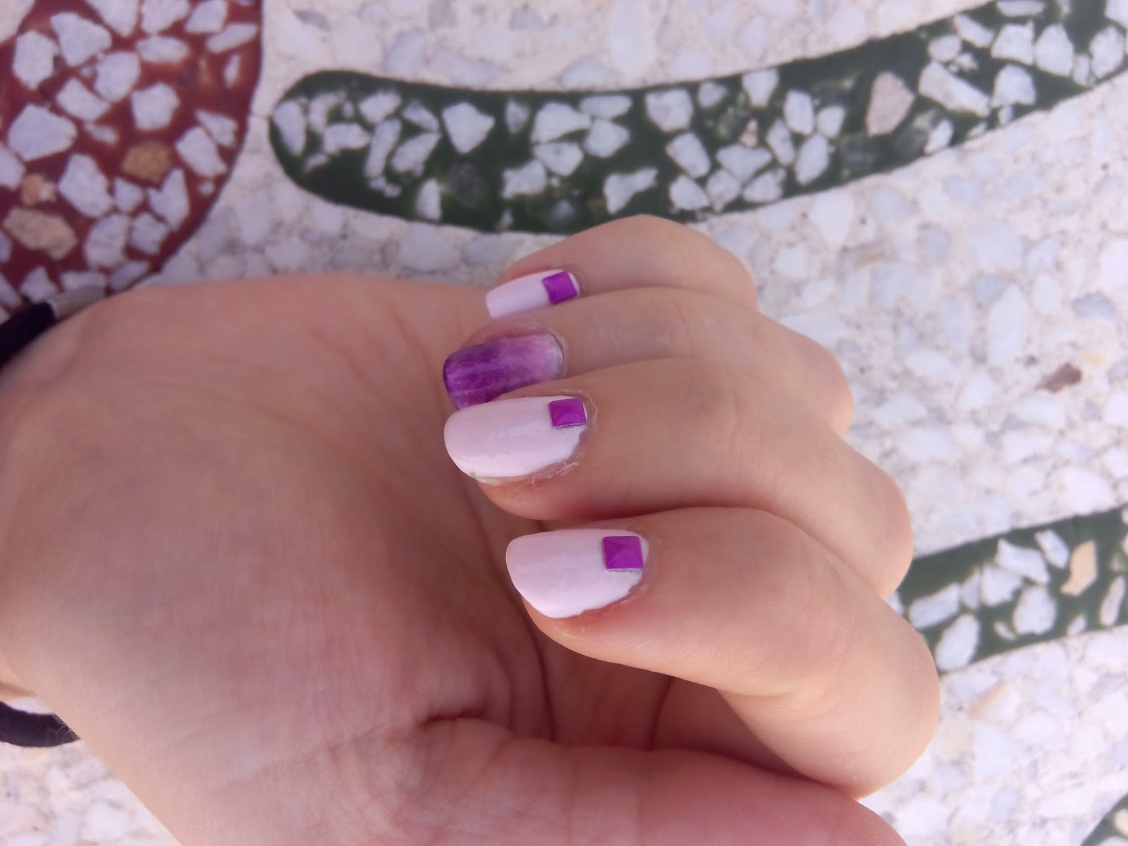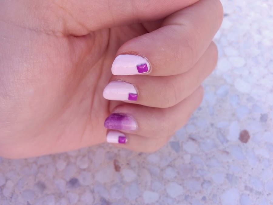 Pienso que es una catástrofe porque el degradado no ha quedado "progresivo" si no que se notan muchos los cambios y..no se, no me convence. Personalmente lo que más me ha gustado de la manicura es el color rosita (que es el 203- Lose Your Lingerie de Rimmel London) con las tachuelas que compré en Banggood.