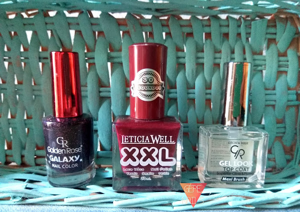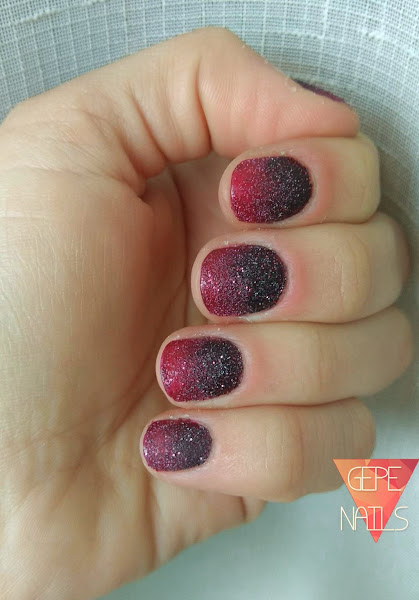 Una vez hecho el degradado usando el color borgoña y el esmalte galaxy, apliqué top coat. Pero no cualquiera, si no el GEL LOOK, de Golden rose. Qué pasada de esmalte. Mirad la diferencia que hay entre aplicarlo (las dos uñas de arriba) a dejarlo sin nada. ⤵