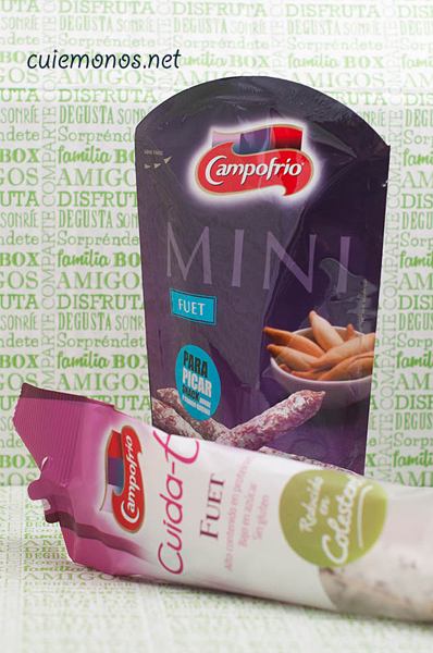 Fuet "cuidándote" bajao en colesterol y ¿mini bolitas de fuet?, de Campofrío (PVP: 1,72e y 1,28e respectivamente):
