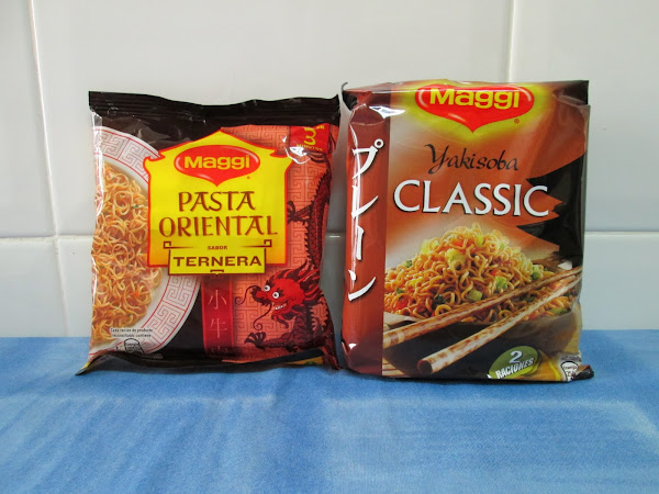 Dos packs de "Maggi", una rica pasta con fideos orientales y un sazonador, en la que por tan sólo 3 minutos podrás disfrutar de todo el sabor de Oriente. Ambos son ricos en especias y condimentos que le dan un toque crujiente. Su precio es de 0,75?, pata oriental, y, 1,70?, pasta Yakisoba.