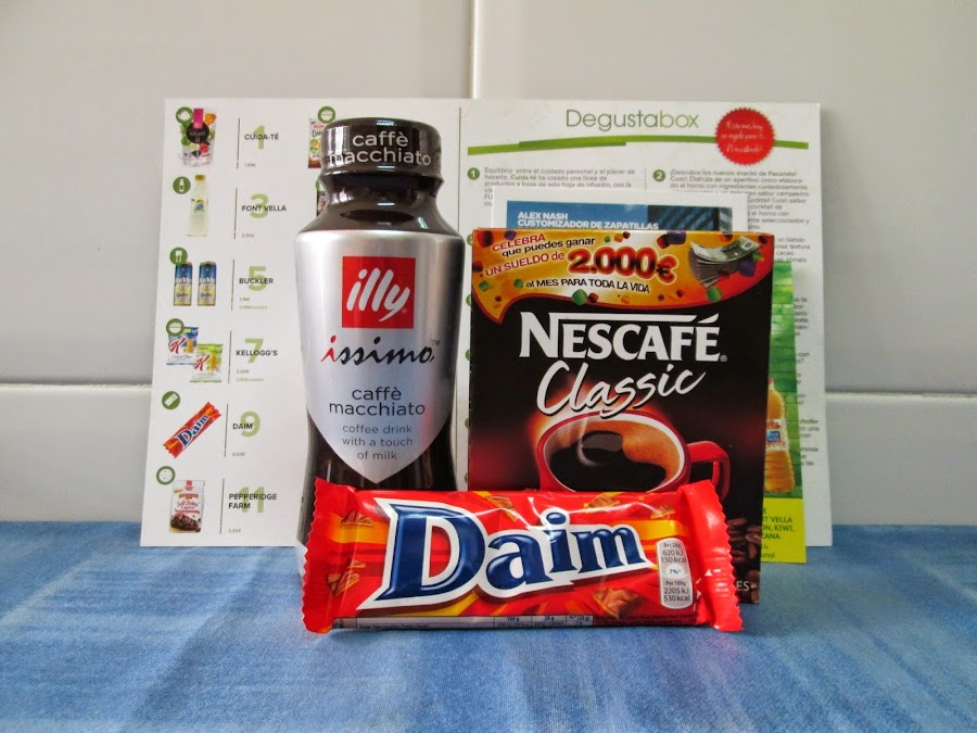 Para el desayuno, la caja trae, una caja de "Nescafé", un café con mucho aroma y sabor 100% puro café, gracias a su revolucionario proceso de fabricación y su punto de tueste. El precio de la cajita es de 1,12?. Y, también, como detalle, viene una chocolatina, "Daim", por tan sólo 0,53?. Es un suave chocolate con leche, y con un delicioso y crujiente relleno de caramelo y almendras.