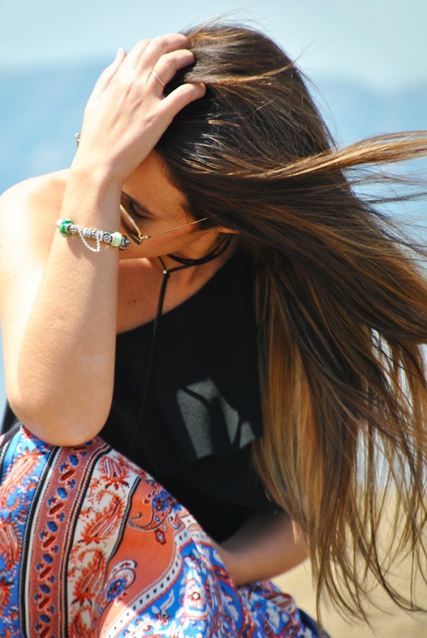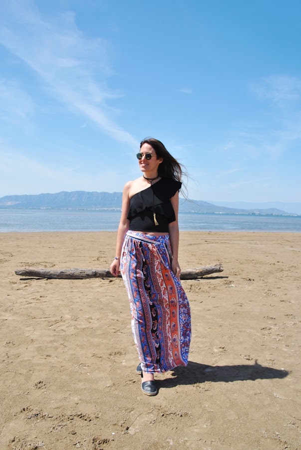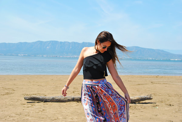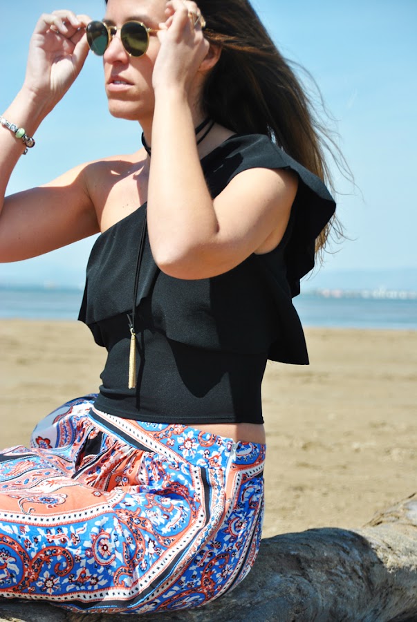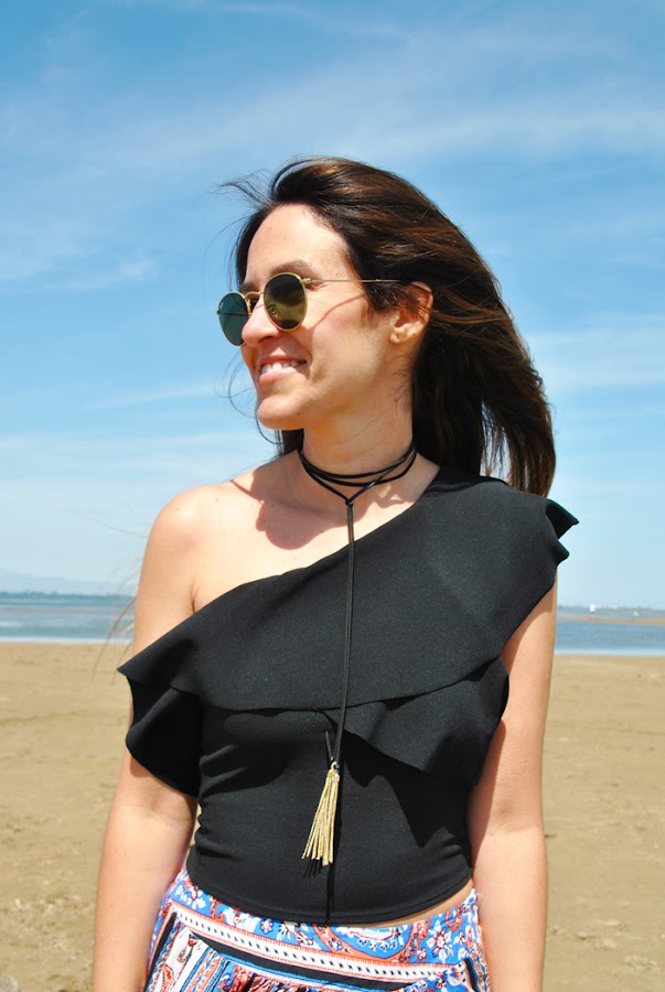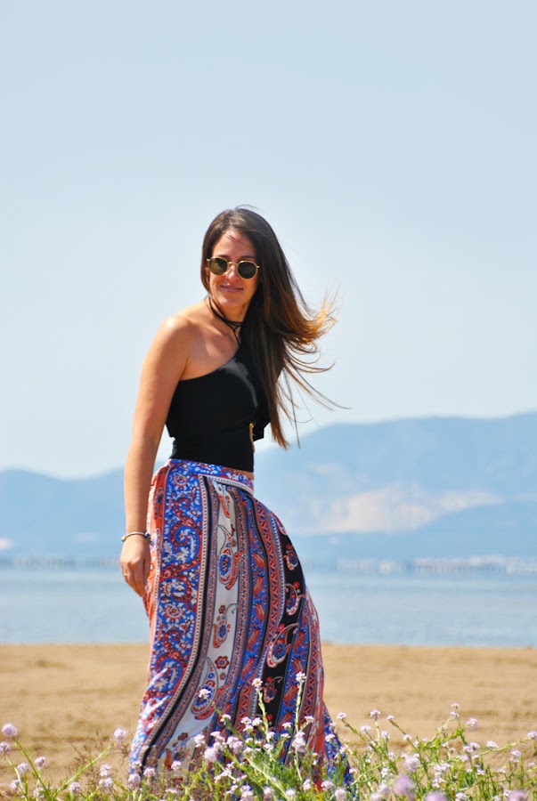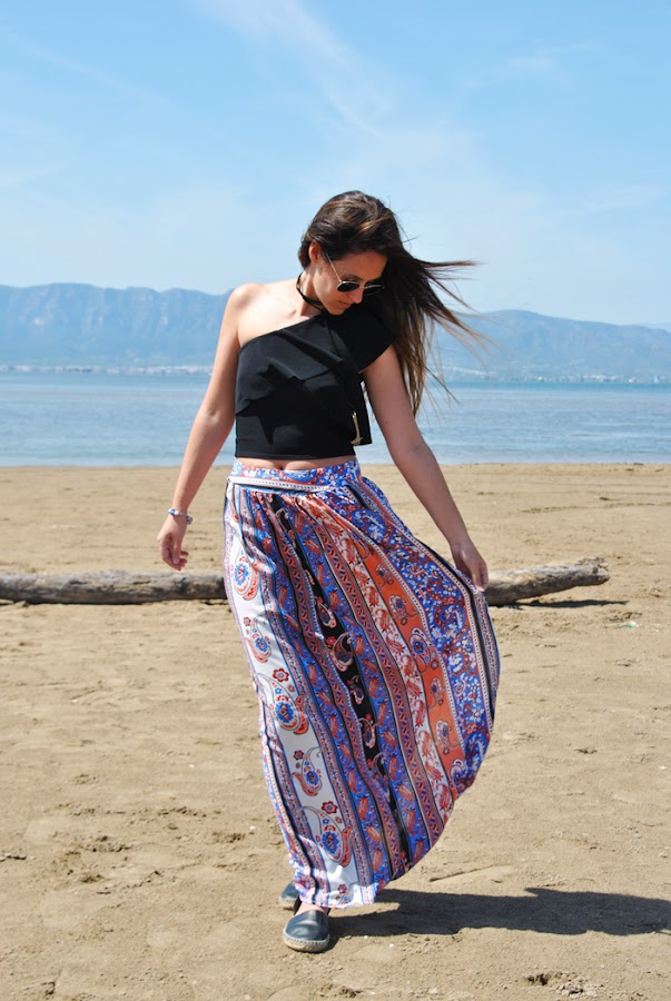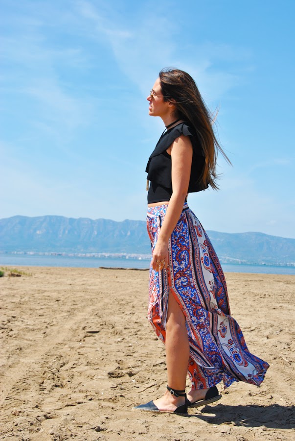 En el look llevo una falda larga de estampado étnico en colores vivos, la conseguí en Romwe y me gustó mucho por su raja lateral y el movimiento que aporta, además es muy económica. La combiné con un crop top asimétrico con volantes y choker de lazo.