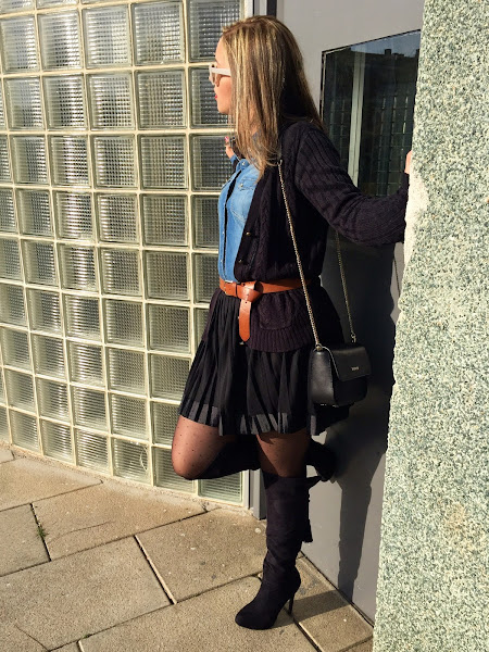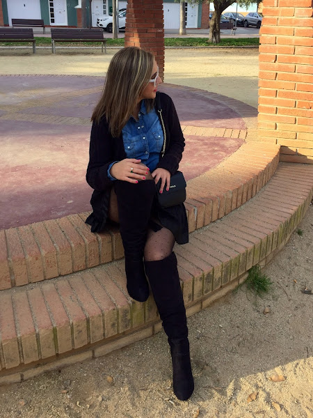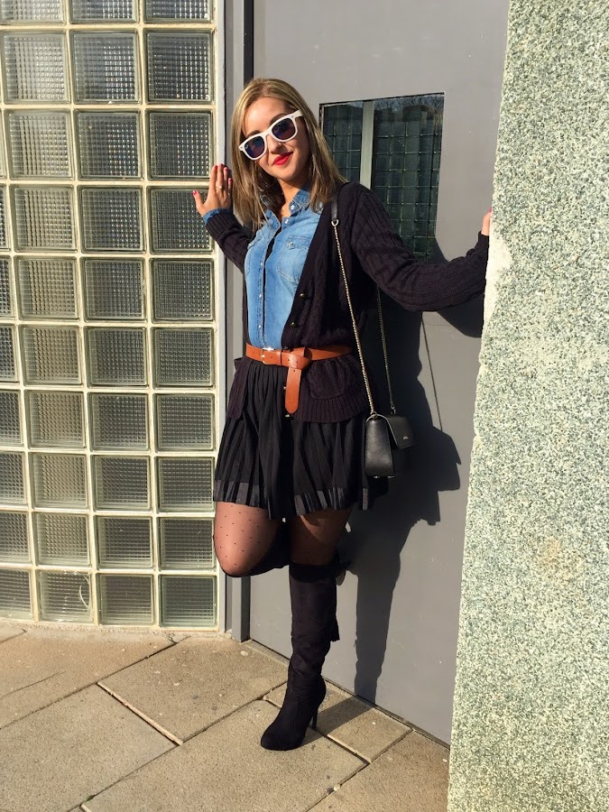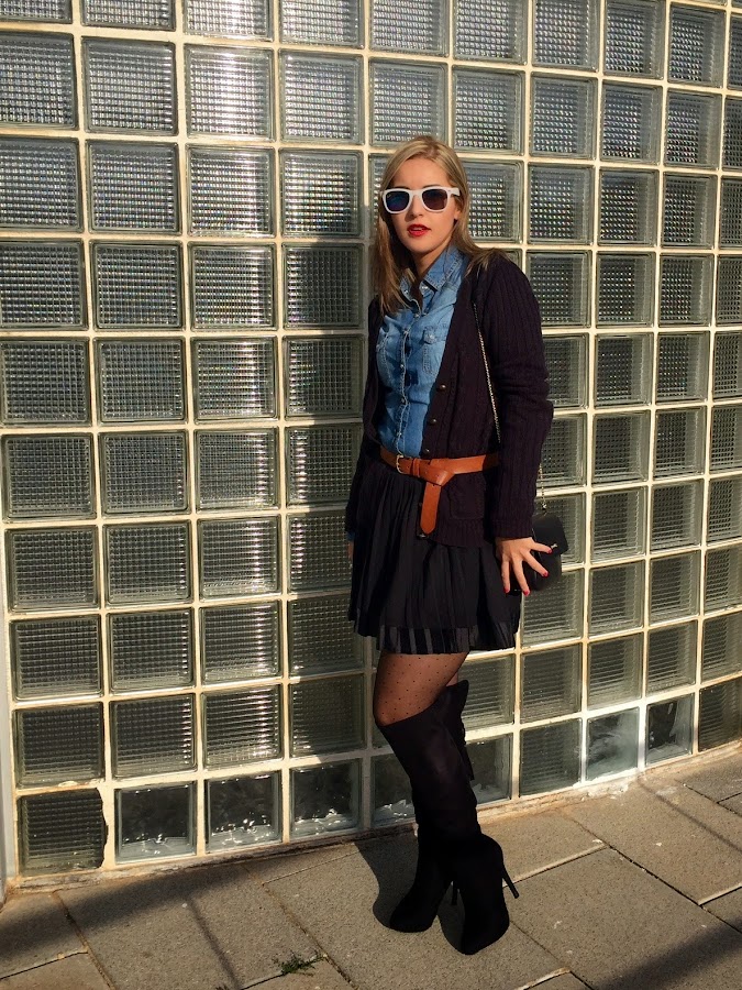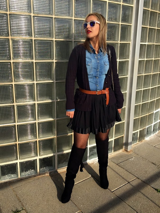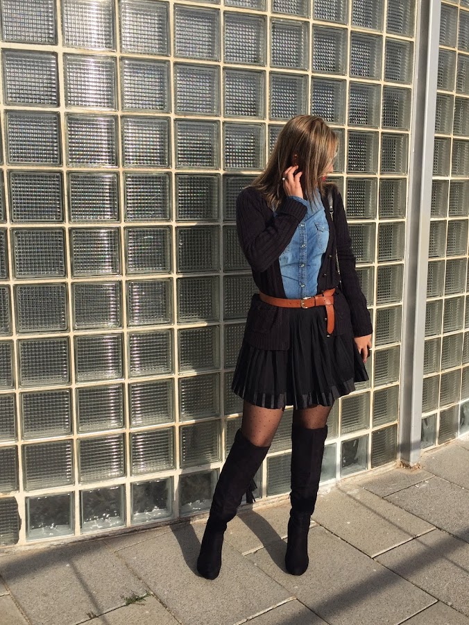Good night loves! I don"t know if you think like me, but the weekend ends very quickly and the Monday is here again. Then, we start a new week, with a new outfit. Today I show you the outfit I wore last Sunday to celebrate my birthday with my family. In the outfit of the day, I wore a black skirt with denim shirt and knitted jacket. The accessories of the outfit were a brown belt, overknees boots and my bag of Tous.