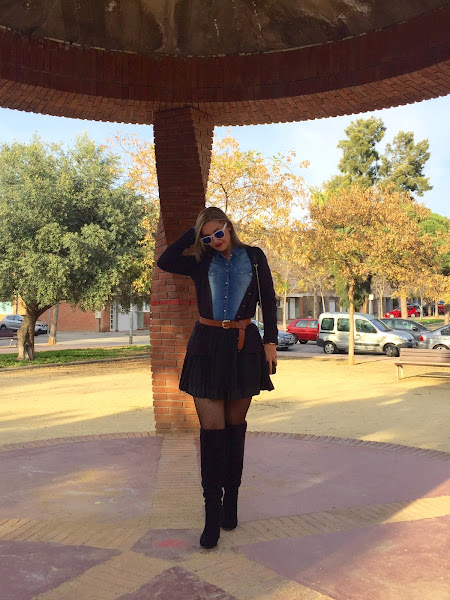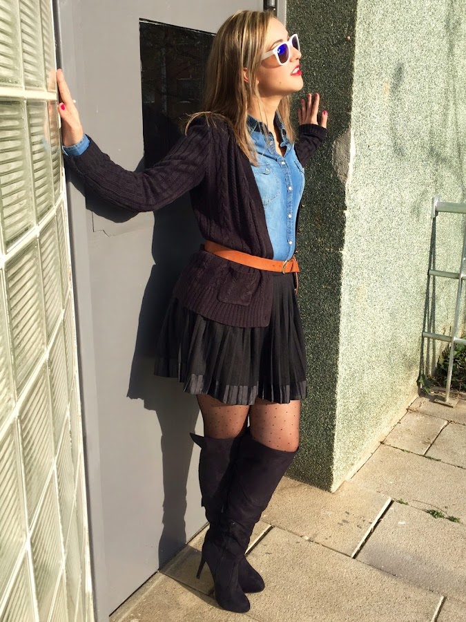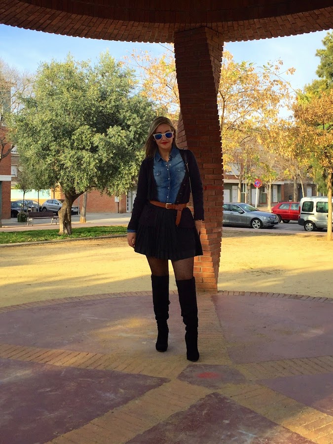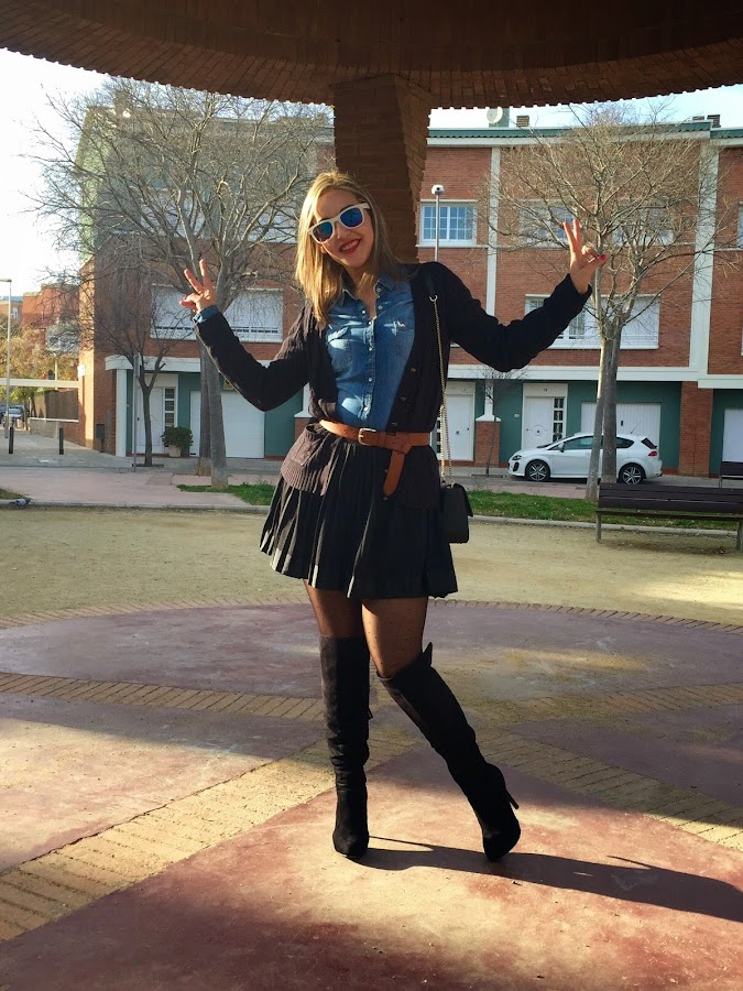 !Buenas noches amores! No sé si os pasa lo mismo que a mi, pero el fin de semana se me pasa volando y otra vez estamos a lunes. Así que empecemos nueva semana, con un nuevo look. El look que os enseño hoy, es el que lleve el pasado domingo para celebrar mi cumple con mi familia. En el look de hoy llevo falda plisada con camisa tejana y chaqueta de punto. Los accesorios del look, cinturón marrón, botas XL y mi bolsito de Tous.