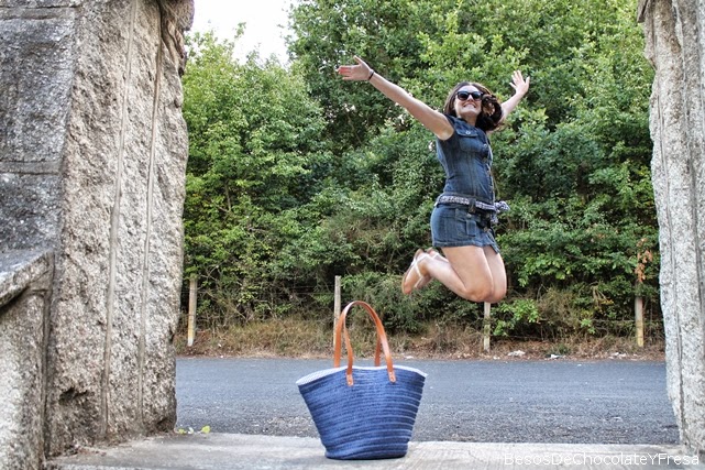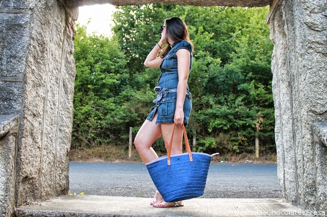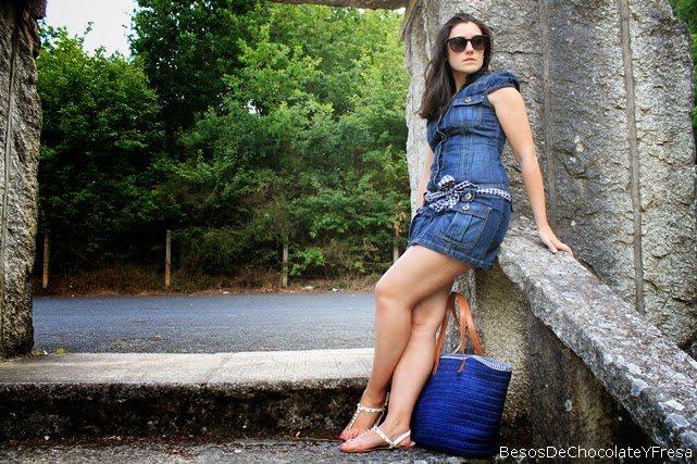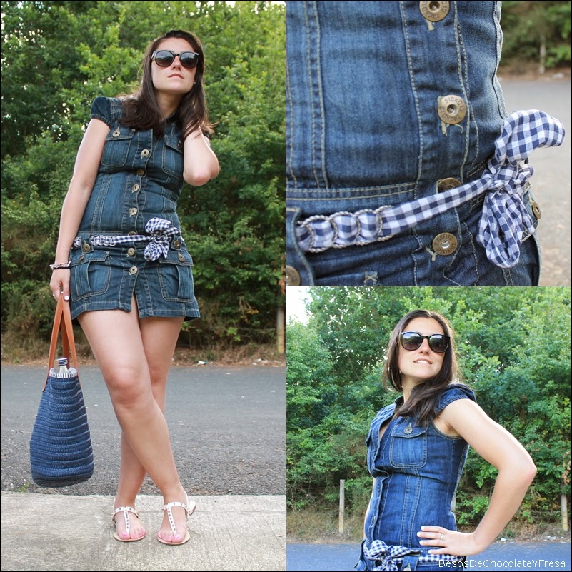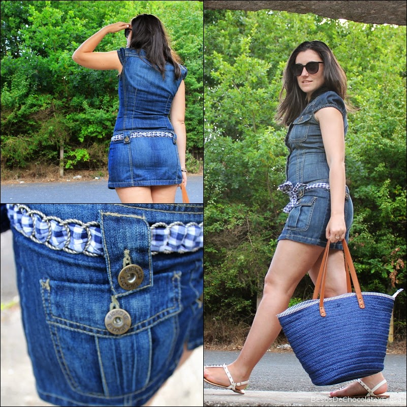 Hoy os enseño un look total denim, compuesto por este vestido entallado totalmente vaquero de manga corta con cinturon de tela de cuadros vichy. Como complementos opté por sandalias de pinchos y capazo en azul marino.