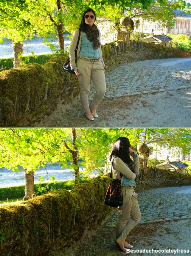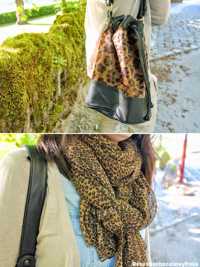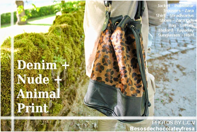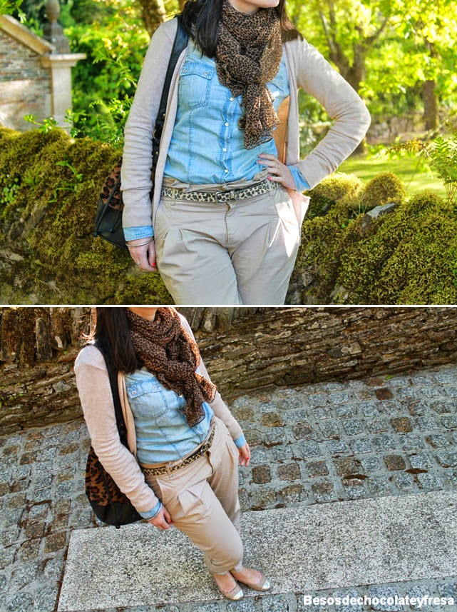 Hoy os enseño un look en tonos nude con toque denim y animal print. Llevó pantalones de pinza nude al igual que la chaqueta, camisa denim y como complementos bailarinas nude, bolso bombonera, foulard y cinturon animal print.