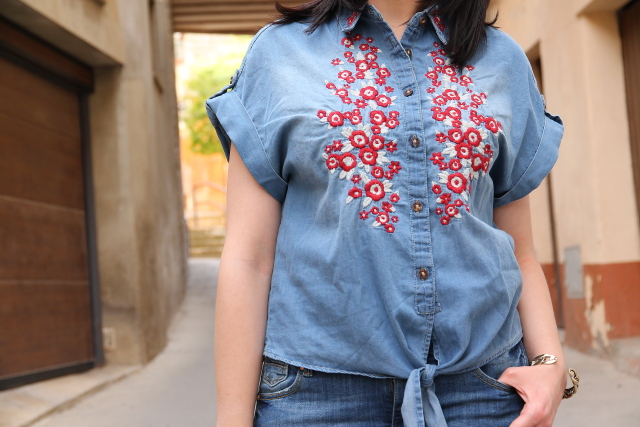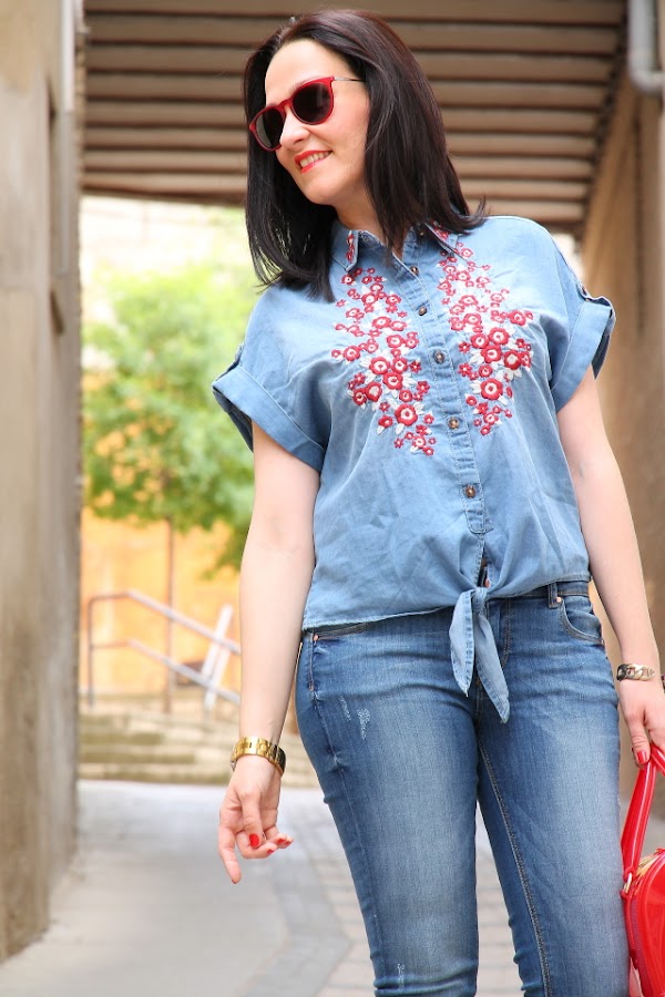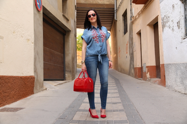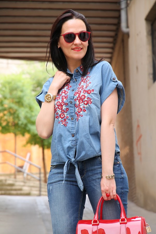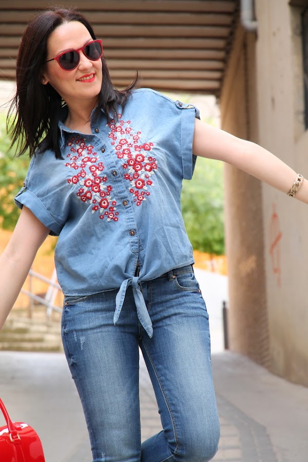 Denim on denim, una combinación de las que me encantan. En el caso del look de hoy aun me gusta más por el bordado de flores de la blusa, le da un aire más chic, como a mi me gusta. He optado por combinar el rojo del bordado con los complementos y mi bolso preferido para el verano.