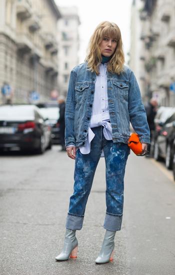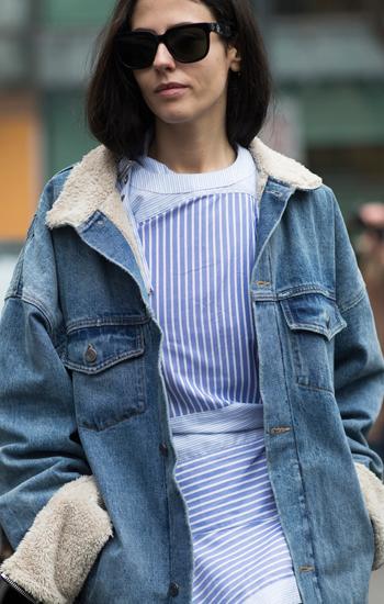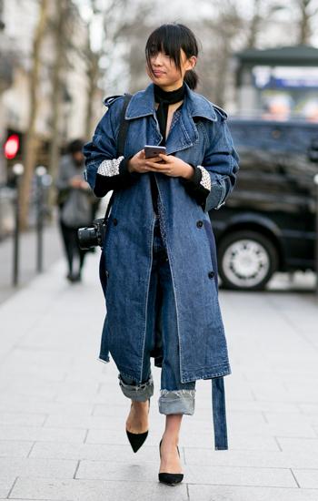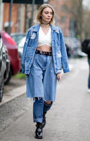 -Conjunto tricolor en denim lavado y abrigo oversize.