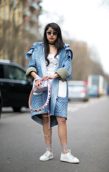 -Abrigo vaquero acolchado, vestido con apliques de flores y deportivas con calcetines.