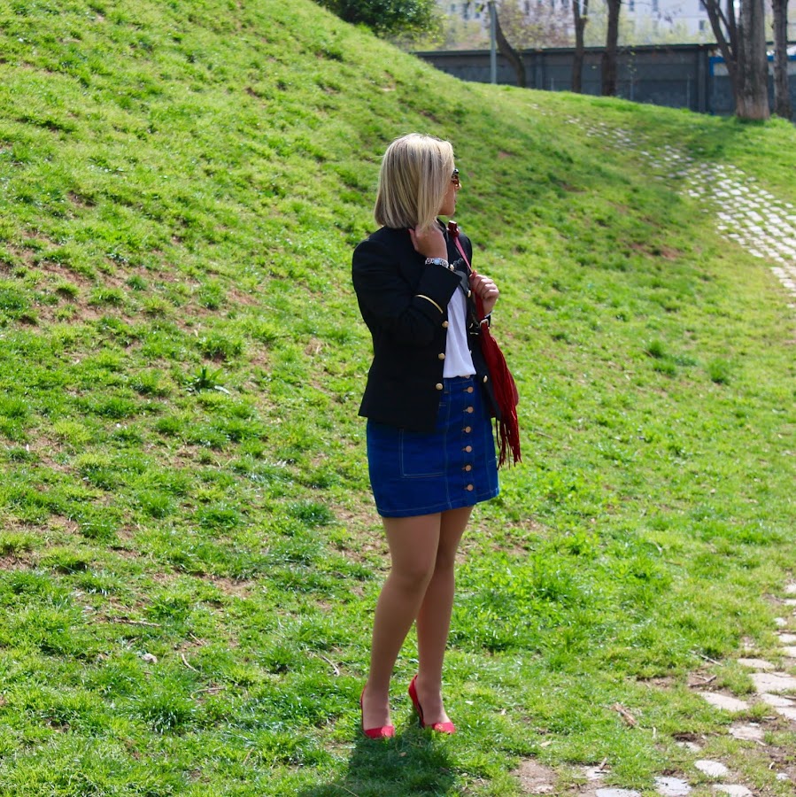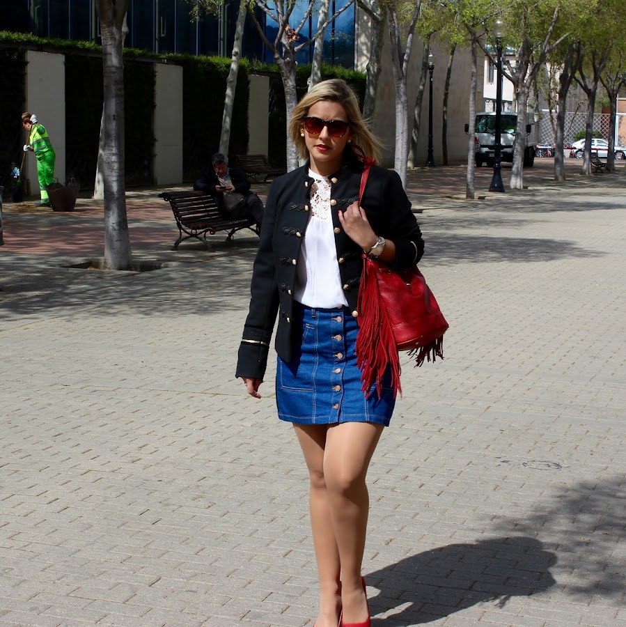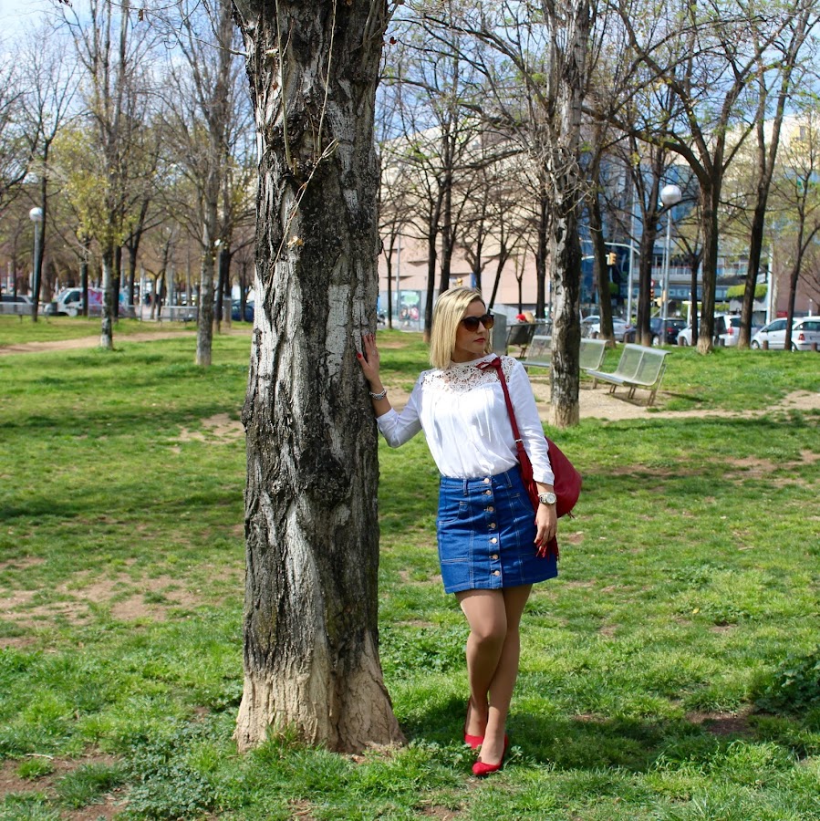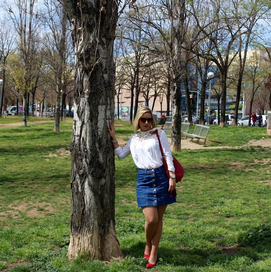 Were in April and I hope that the temperature will rise and we will be able to quit our coats and jackets and start wearing spring outfits. In the outfit of the day I show you an outfit that is perfect for the spring and very feminine. In the outfit I wear a 70s denim skirt with a white lace shirt and a navy jacket that I think that I will use it a lot during this season. To give a touch of colour, I put my red stilettos with a red bag with fringes.