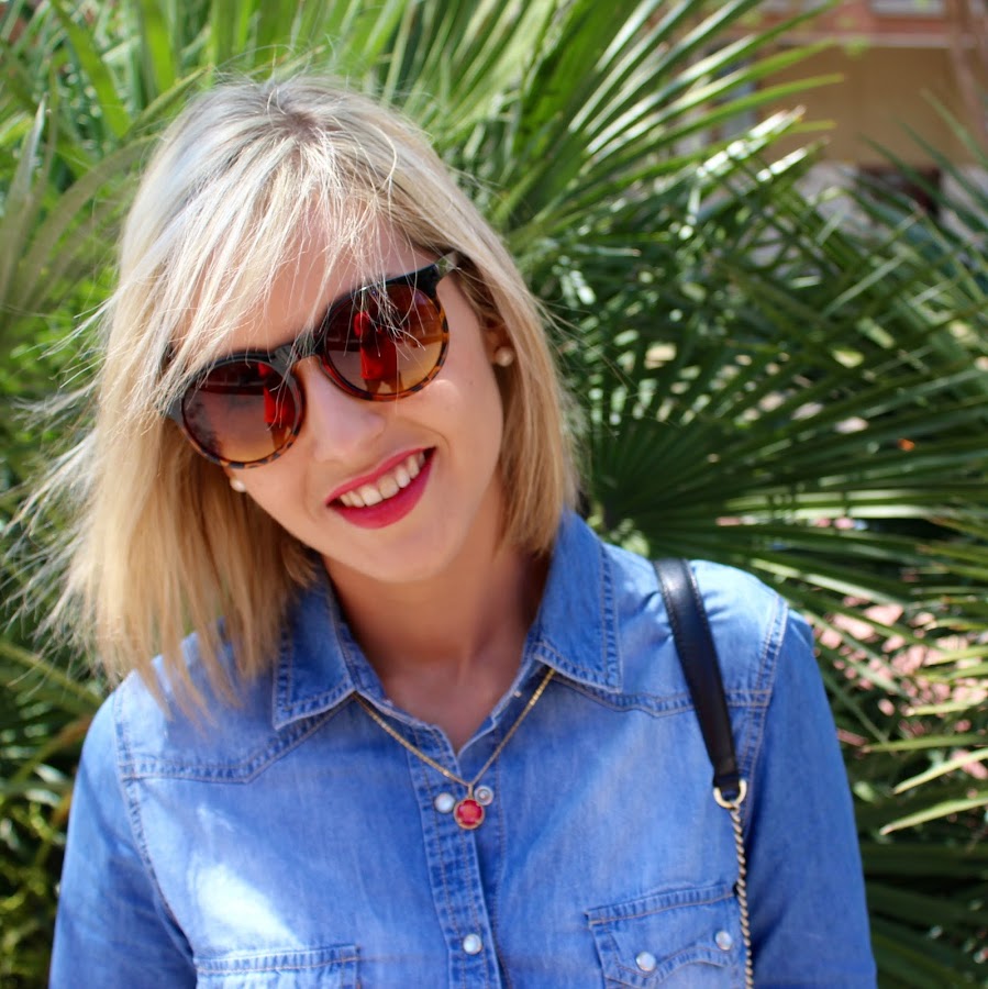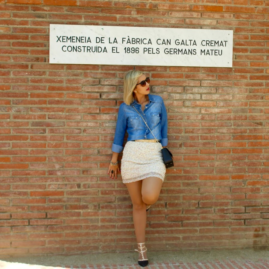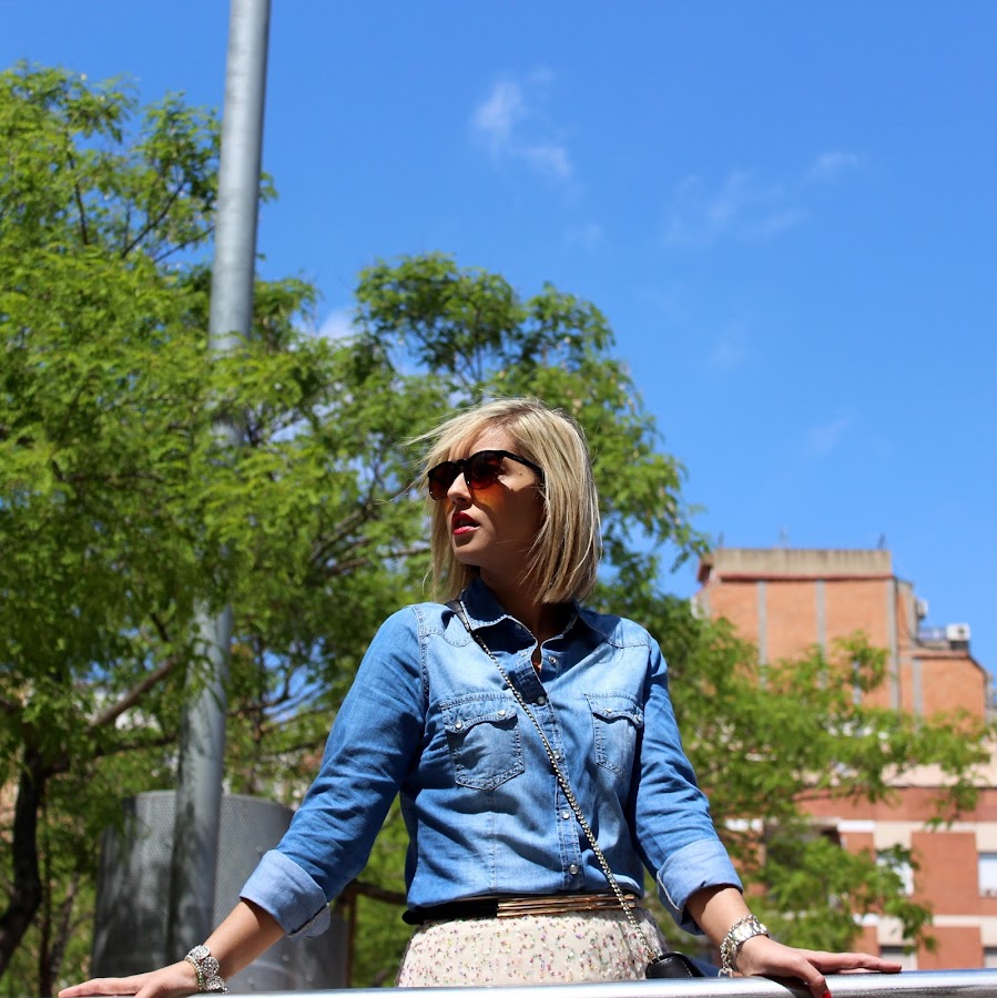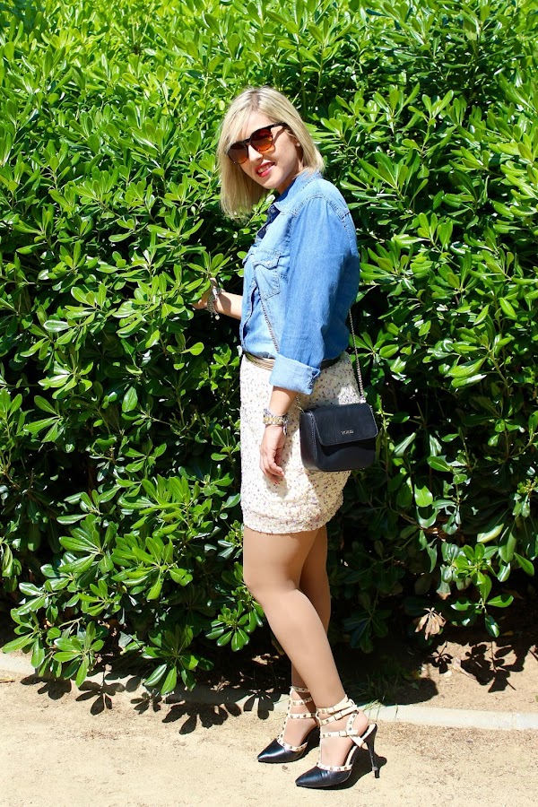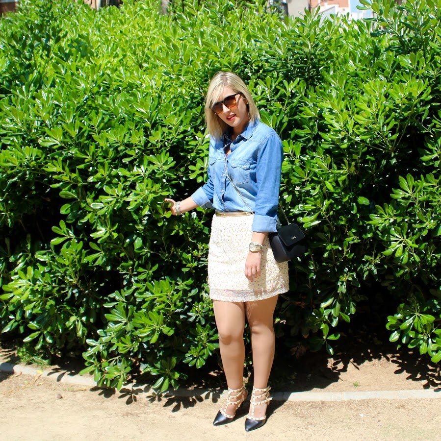 Today I show you a chic outfit that its perfect to go for a dinner or to drink something at the afternoon. I wear my denim shirt with a nude skirt with sequins that I had in my closet some months ago. I put a golden belt to mark the waist, a black bag of Tous and my stilettos similar to Valentinos.