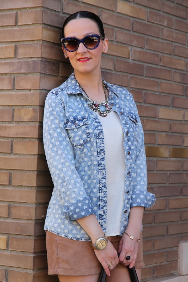 Muchas veces nos rompemos la cabeza pensando que ponernos y no pensamos que a veces los mejores looks son los más sencillos. El look de hoy es uno de ellos, un combo formado por una camisa tejana con print de corazones, top crudo y shorts de piel camel. Un estilismo compuesto por prendas que prácticamente todo el mundo tenemos en nuestro armario y que juntas con los complementos adecuados como el collar joya que llevo quedan realmente bien.