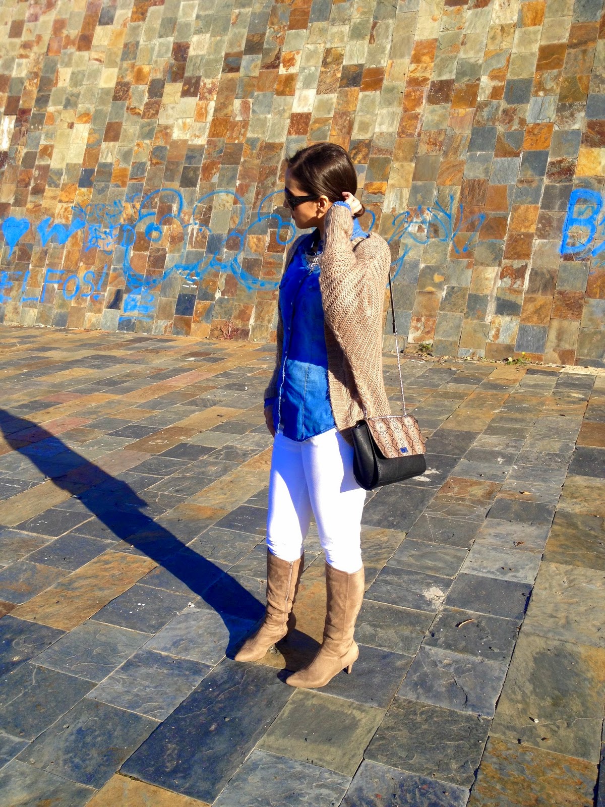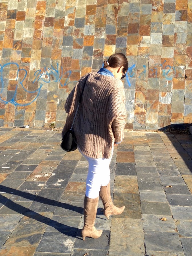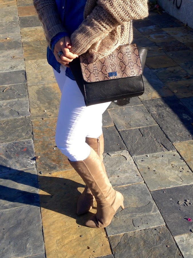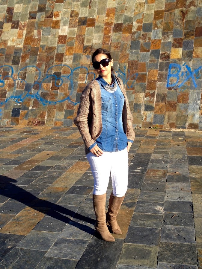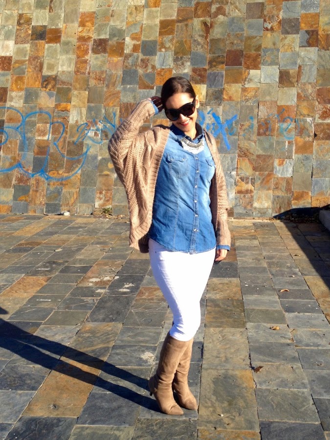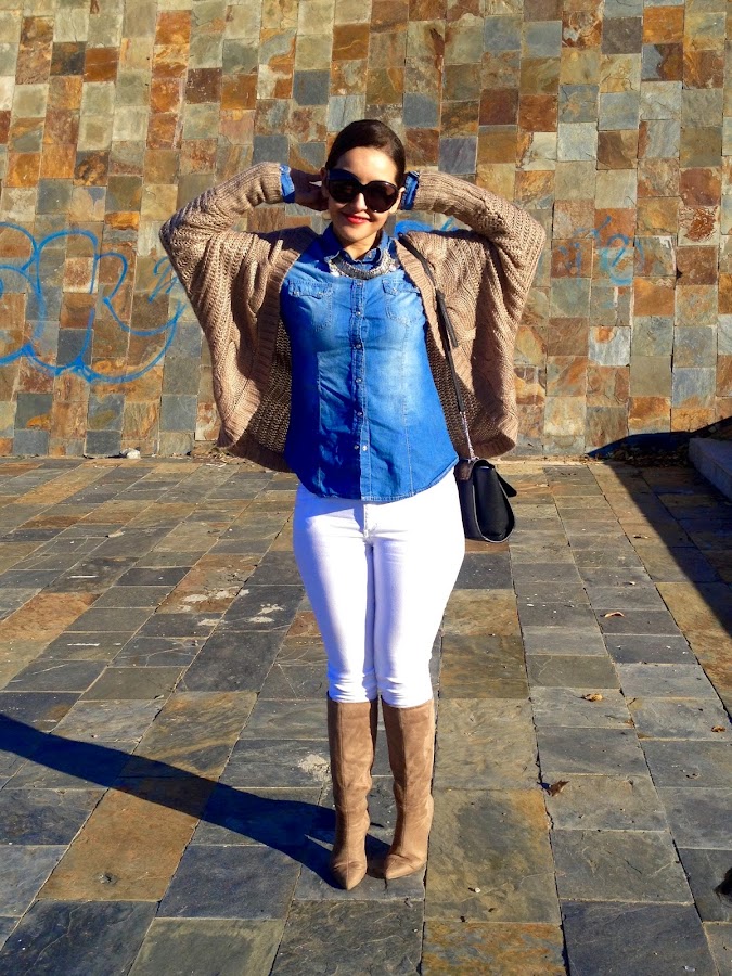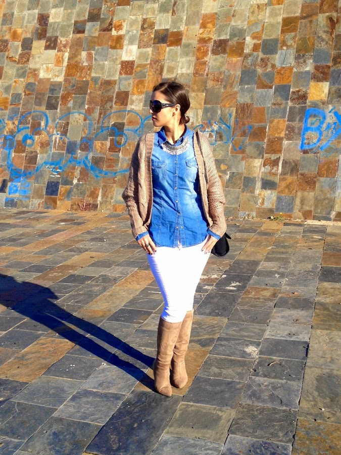 ¡Buenas noches amores! ¿Cómo lleváis el puente? Espero que bien, el mío ha sido muy tranquilito. Os dejo el look que lleve este domingo para ir a comer a casa de mi madre, un look cómodo con camisa tejana y pantalones blancos, con una chaqueta de punto en beige. Como complementos, mi nuevo bolso de Stradivarius y mis botas beige.