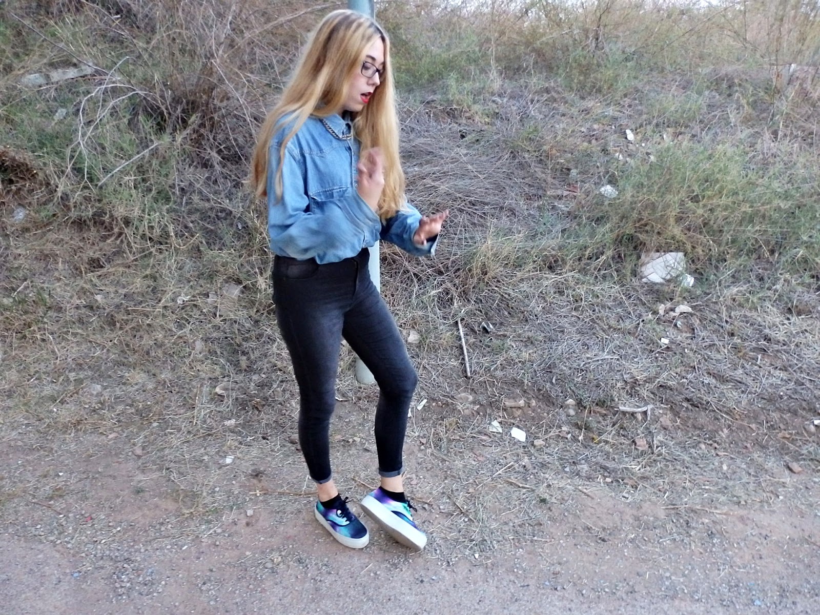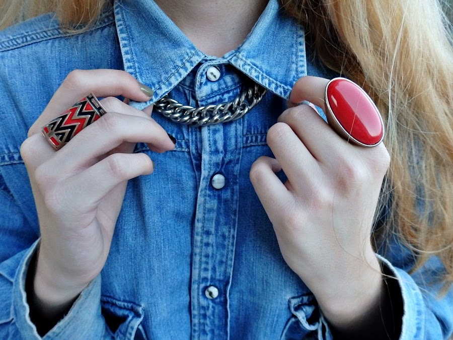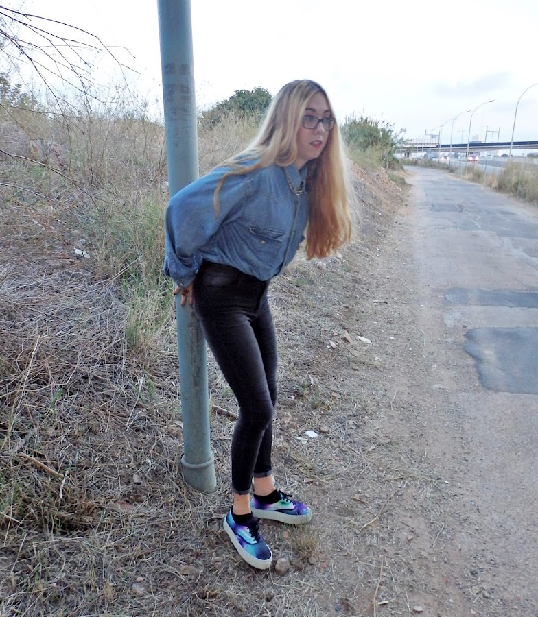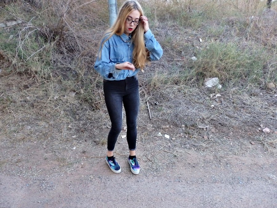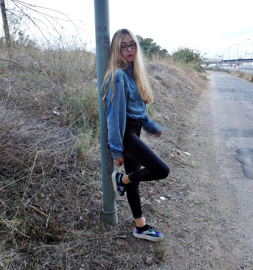 Hoy os traigo un outfit que a mi personalmente me encanta, lo he utilizado ya varias veces, entre ellas para ir a la Valencia Fashion Week. El conjunto está formado por una camisa vaquera metida por dentro de unos pantalones negros de tiro alto; como calzado he escogido las zapatillas de plataforma que ya habéis visto varias veces, estas le aportan mucha personalidad y vida al look. Como accesorios me he decantado por anillos en tonos rojos que conjuntan con el color de mis labios, y un collar de cadena.