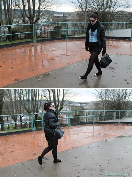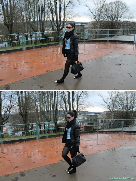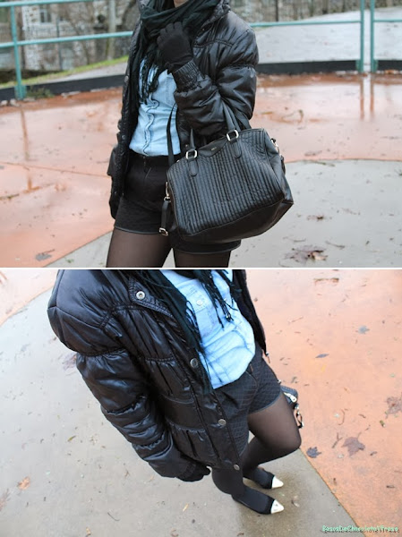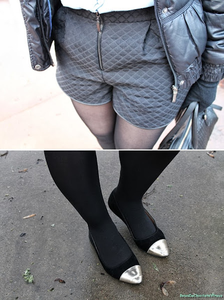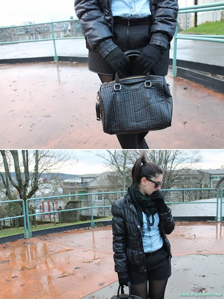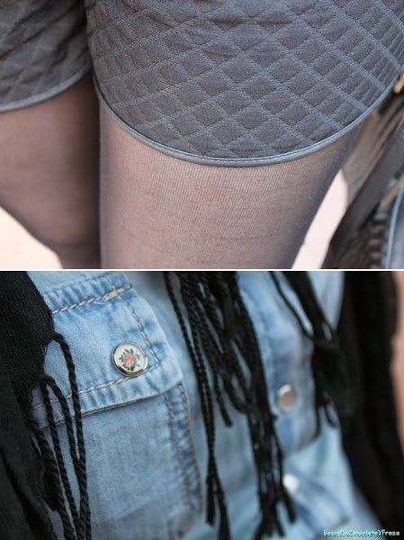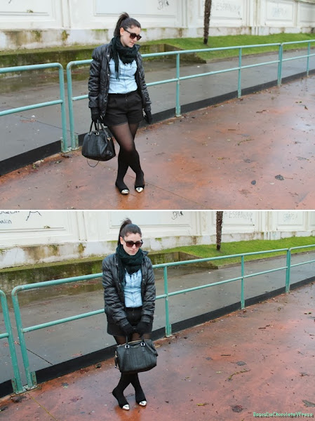 Today I"m in a look I wear my new shorts in black quilted effect, two side "pockets", I say that in quotes are fictitious hehe. The combined it with denim shirt, another basic essential in a closet and never gets old, black flats with gold ferrule and black feathers as accessories and scarf tote bag in black also.