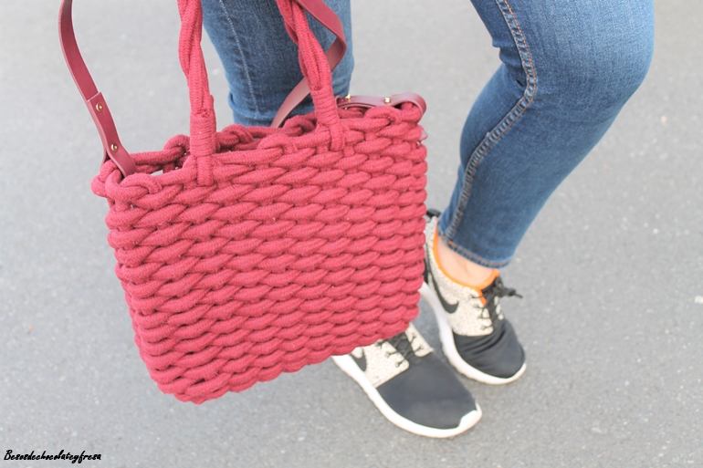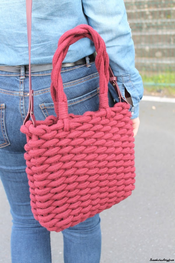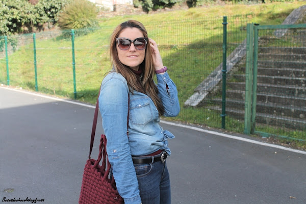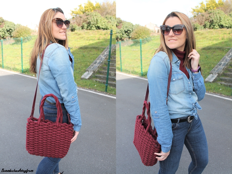En el look de hoy apuesto por ambas opciones, camisa denim más clarita con jeans más oscuro y jugando con las texturas con botones y bolsillos en las camisas que hacen un look más vistoso. Aporto color con sweater de cuello cisne en canalé en color burdeos a juego con el bolso de cordón trenzado (reciente adquisición de las rebajas). Sneakers y look completo