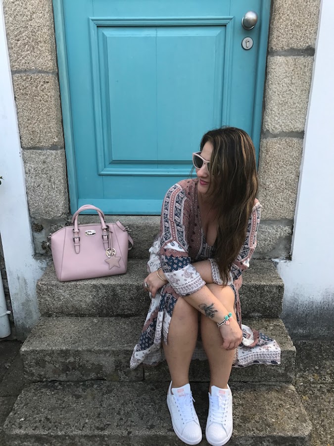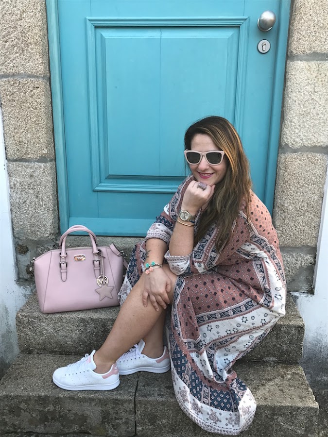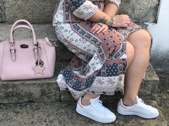 Deportivas Stan Smith en color rosa y print de coco, combinadas con bolso del mismo color para complementar el look y darle un aire primaveral total.