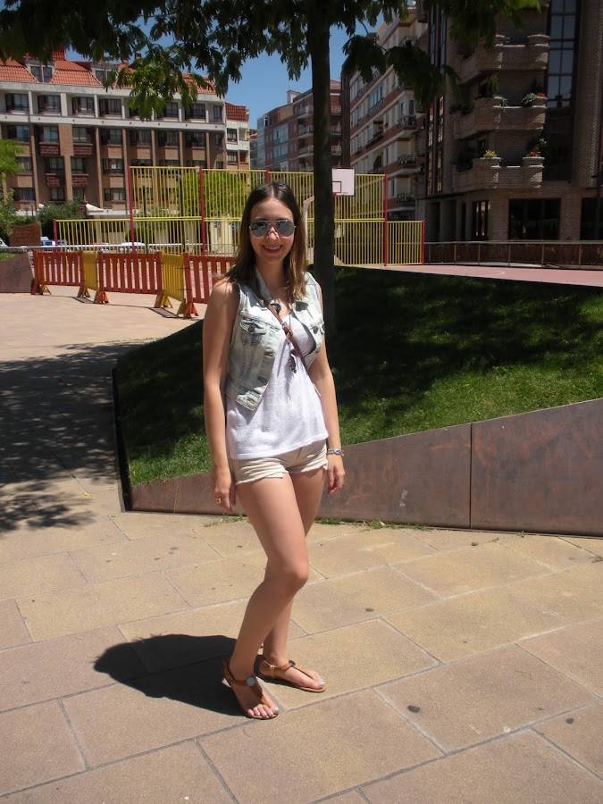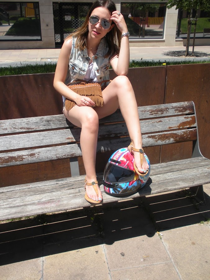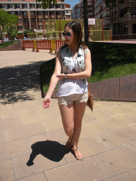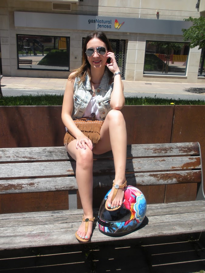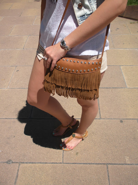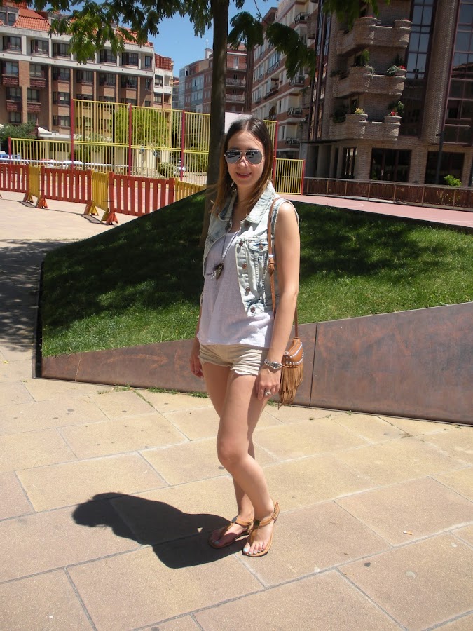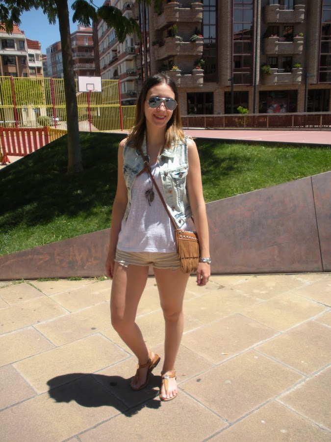 Hoy os traigo un look ideal para estos días de calorazo que estamos teniendo. Unos shorts, una camiseta básica, un chaleco vaquero para darle rollo al outfit y mi nuevo bolso de flecos y mis nuevas sandalias.