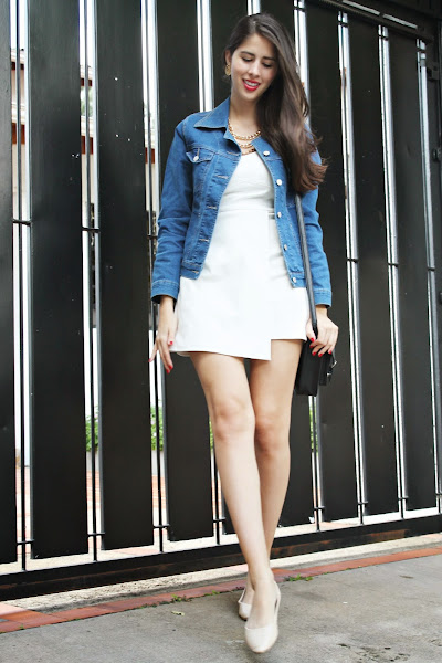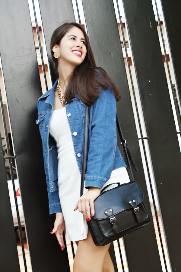 El vestido es de choies y ya lo han visto AQUÍ es una de las prendas más versátiles que tengo en mi closet así que les recomiendo totalmente tener un vestido blanco simple ya que pueden jugar con miles de combinaciones sin verte nunca repetida. La chaqueta de jean es nueva, la compramos en una tienda de mi ciudad y nos costo muchísimo encontrarla (ahora ando en la búsqueda de una más clara). Unos flats nude que son un básico total, un bolso estilo mensajero y accesorios dorados para darle más vida al outfit.