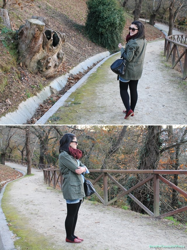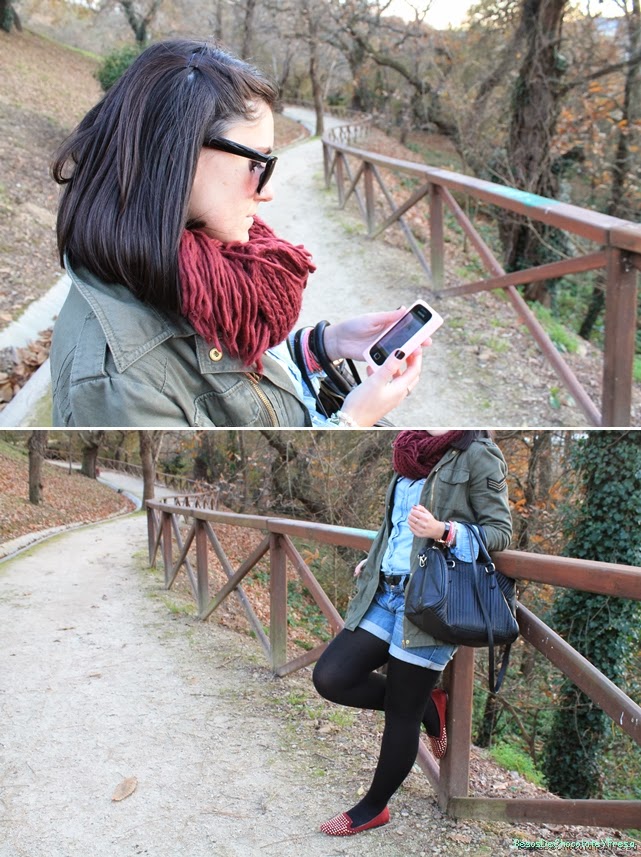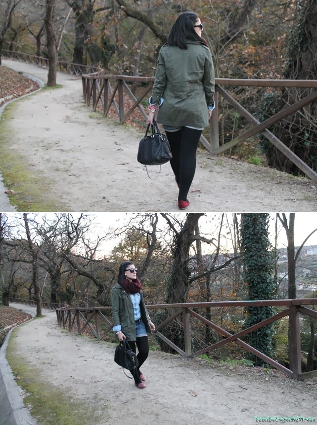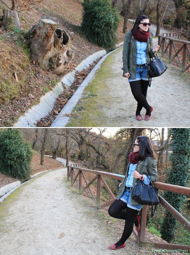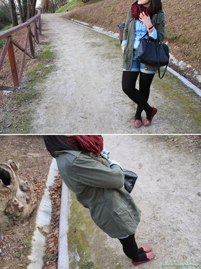 For today"s look I combine the burgundy and green military denim. Wear shorts and denim shirt, slippers and burgundy parka military green. As accessories tote bag in black and burgundy colored scarf just like slippers.