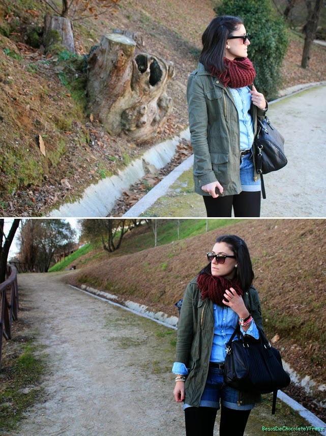 Para el look de hoy combino los colores burgundy y verde militar con denim. Llevo shorts y camisa denim, slippers burgundy y parka militar en verde. Como complementos bolso tote negro y bufanda en color burgundy al igual que las slippers.