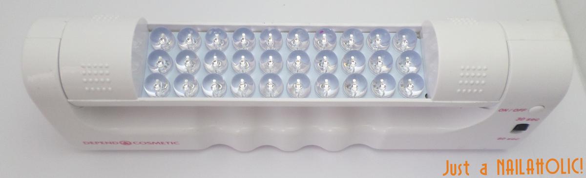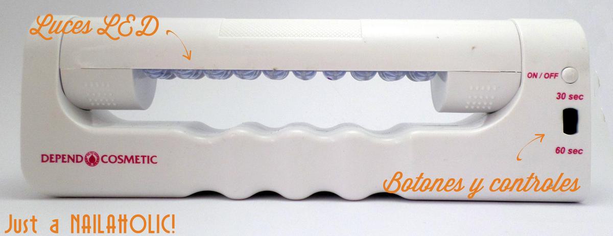 Paso a hablaros un poquito de la lámpara de LED. Es más bien como una lámpara portátil, bastante pequeña (19x4x6,5 cm), de 12V y muy fácil de usar. En la parte superior tiene 3 tiras con 10 bombillas y en la parte inferior como veis la formita para poner los dedos en la posición correcta. A la derecha están los botones de control: on/off y un botón para elegir si queremos que la luz dure 30 o 60 segundos activa (se apaga automáticamente cuando pasa el tiempo que indiques).