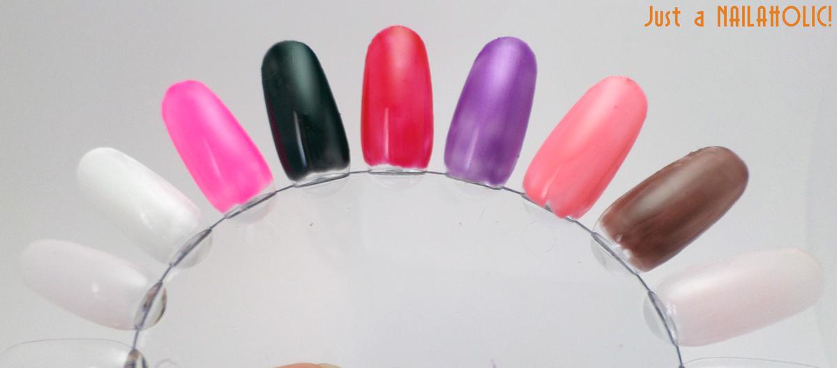 Y aquí tenéis los swatches (todos tienen una sola capa excepto el lila y el marrón, que quedan bastante poco opacos). Los tonos son, por orden de izquierda a derecha: