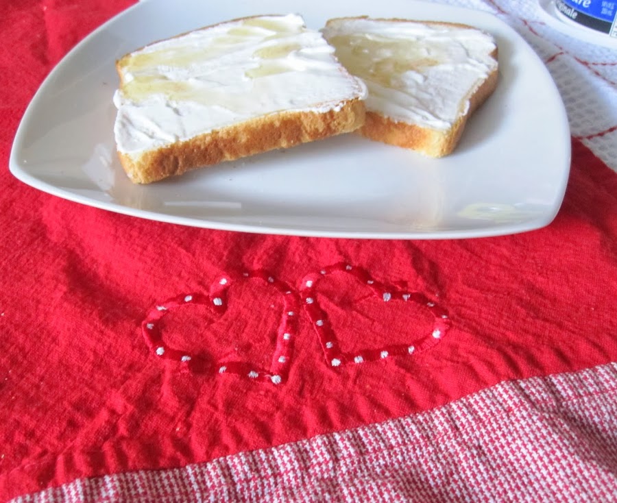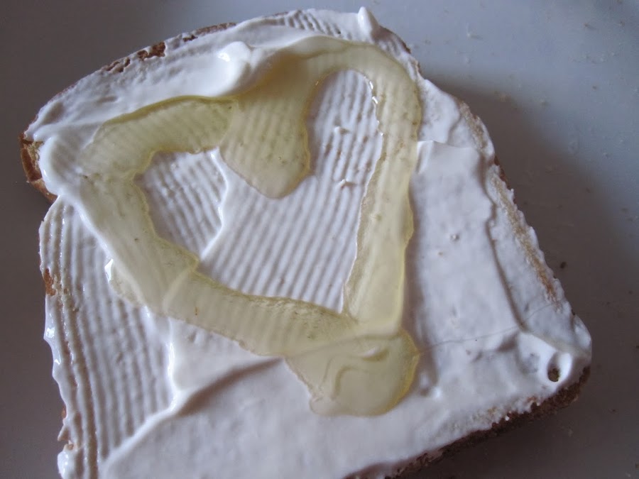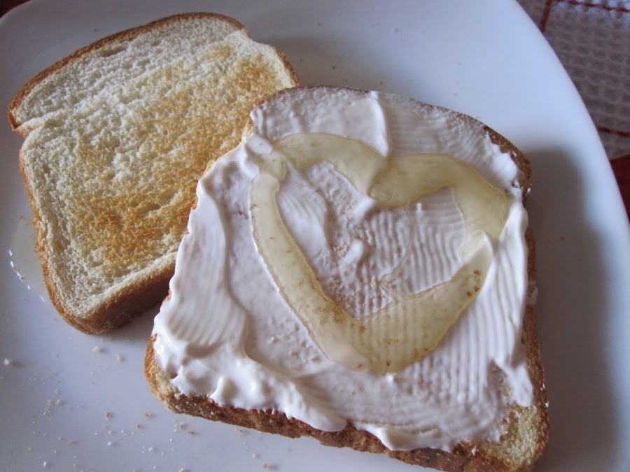 Lo único que tienen que hacer es: tostar el pan de molde, untar el queso crema y hacer un corazón con la miel para sorprender a nuestro invitado.