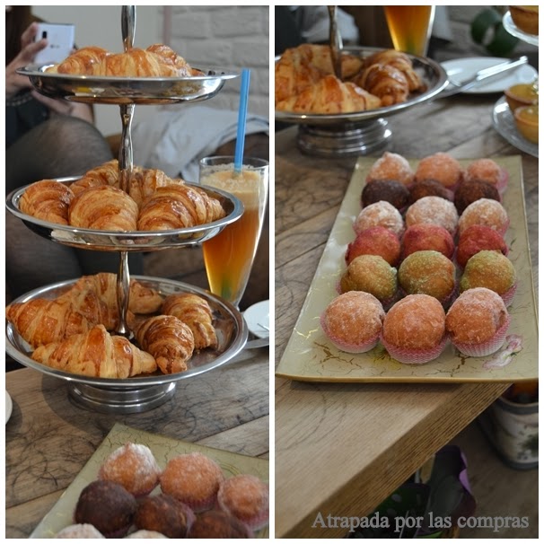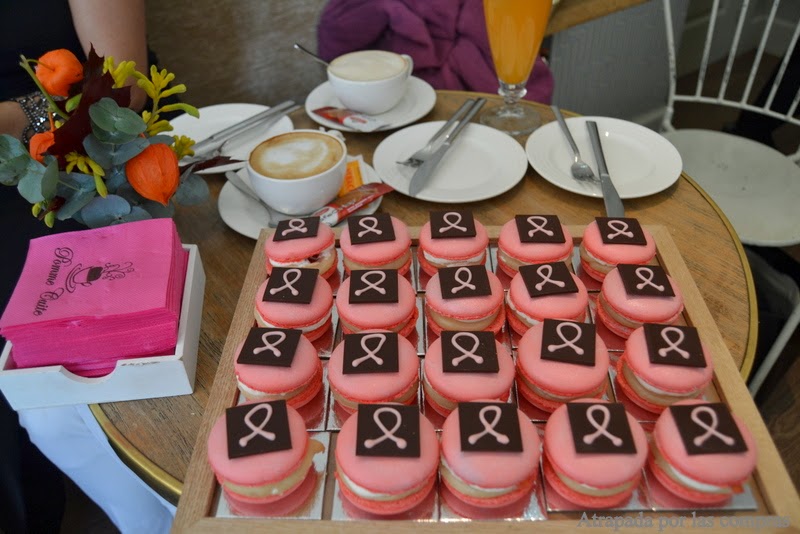 POMME CUITE nos preparó un desayuno en el que no faltaron las últimas novedades de pastelería para este otoño-invierno, surtido de buñuelos rellenos de arándanos, fresas, frambuesas, pistacho o chocolate, una gateau basque de manzana con su compota, cheese cake de plátano flambeado al ron, macarón de fresas con nata que además decoraron con un lazo rosa al coincidir este desayuno con el Día mundial contra el cáncer de mama, entre otros muchos. Y, por supuesto, no podía faltar el clásico croissant francés, número uno en España en el ranking de los mejores cruasanes de España que hace el periódico El País. Todo realmente delicioso.....