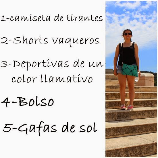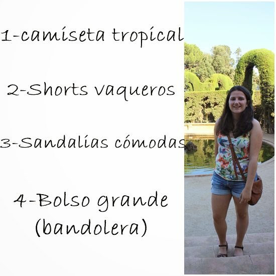El primer look lo utilicé para visitar Montjuic. Ese día hacía un calor horrible por lo que opté por pelo recogido, gafas de sol y comodidad. Si quitamos los accesorios el look se queda muy soso por lo que quise añadirle un toque de color con las zapatillas y el bolso. Este bolso es la clave de mi viaje, puedo utilizarlo tanto de bandolera como bolso de mano y tiene los dos colores más socorridos de mi armario. ¡Perfecto!