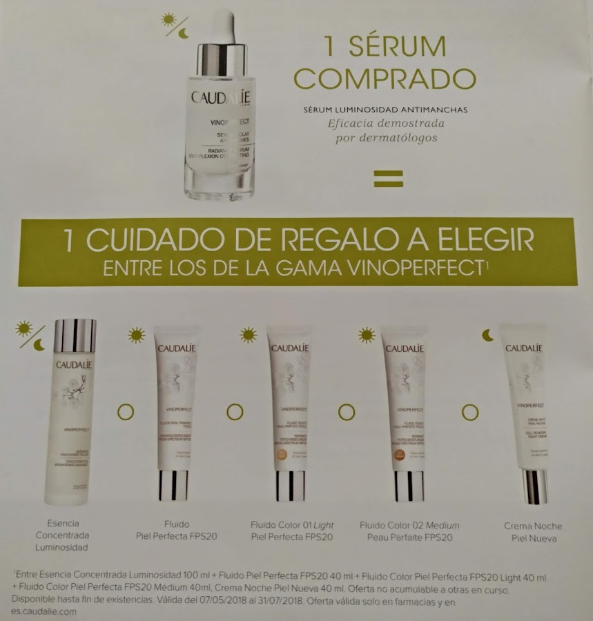 Como Aprovecharlo: Entra en https://es.caudalie.com/ e introduce el código promocionalpromocionalen el momento de la compradel Serum Vinoperfect. Podrás beneficiarte inmediatamente de la ofertaseleccionando el productode tu elección. (Valido del 07/05/2018 al 31/07/2018)