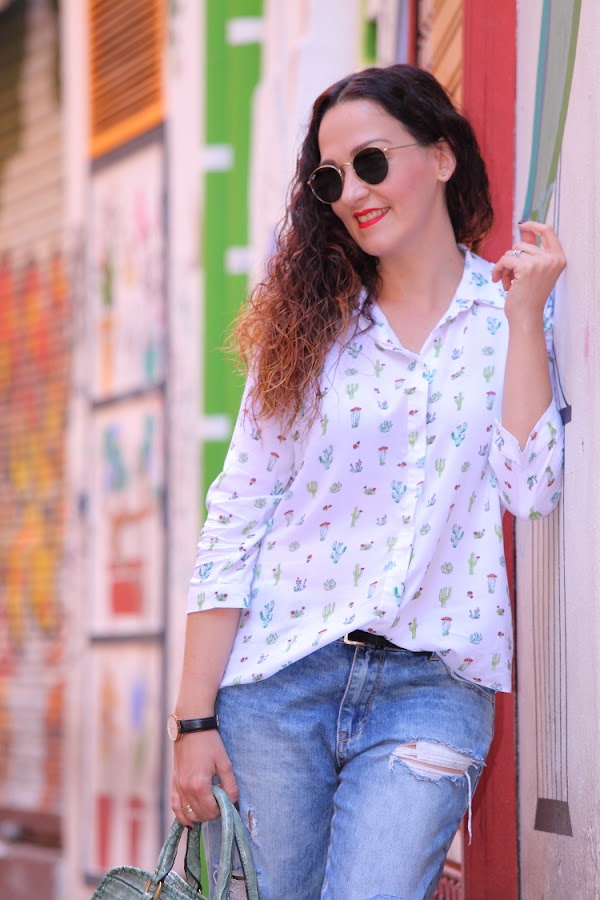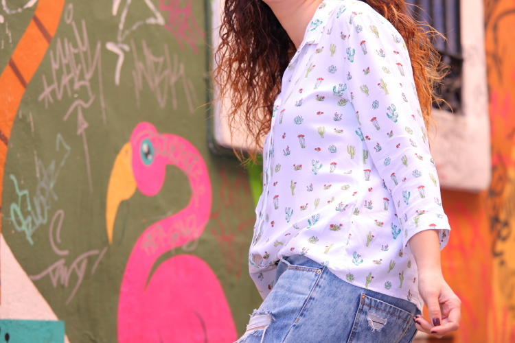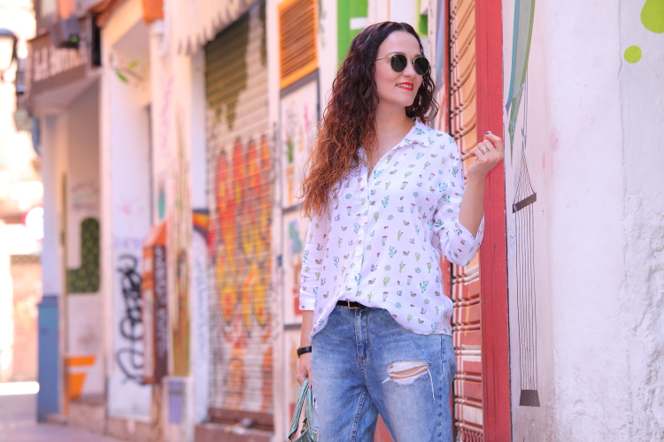Me encanta Zaragoza, el tiempo que viví en ella mientras estudiaba no la saboreé tanto como lo hago ahora. Como con mi chico vamos bastante a menudo, cuando estamos allí y tenemos tiempo, nos gusta pasear y descubrir nuevos lugares. Así es como hace unos días dimos con la calle donde están hechas las fotos. Tenía que ir al dentista y optamos por aparcar más lejos e ir callejeando. Nos sorprendieron tanto los dibujos y el colorido de la calle que decidimos hacer las fotos con el look que llevaba compuesto por una camisa con dibujos de cactus, boyfriend jeans y mocasines. Luego vimos que había una placa en la que indicaba que había sido pintada por alumnos de la escuela de arte para rehabilitar la zona. La verdad es que nos pareció una buena iniciativa porque queda genial y alegra el barrio.