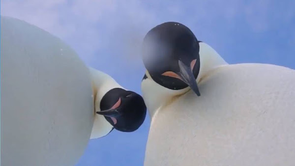 Estas no son las noticias que debería estar leyendo, pero son la clase de noticias que quiero leer. Cuando están grabando a dos pingüinos emperador, éstos descubren la cámara y la miran fijamente. La imagen que ha dado como resultado parece uno de los selfies más adorables de la historia.