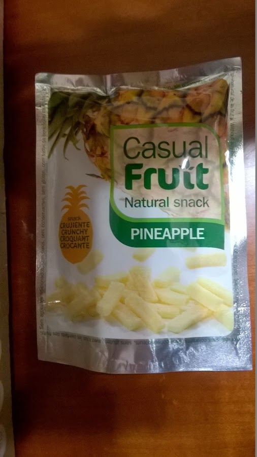 Son snacks para picar entre horas pero de fruta. En mi caso, me tocó de piña y os aseguro que saben a piña piña. Además, oyes el crunch de un snack y dices wooww sabe a piña natural. Muy bueno! Su precio ronda los 15 euros doce bolsitas de 15 gramos