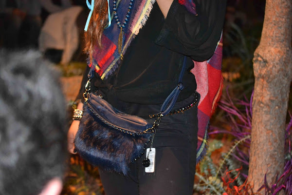 Maravilloso el maxy bolso azul metalizado con bufanda gris de flecos y elegantes gafas de sol negras con un manguito en color azul para las manos. Abrigada y 100% chic.