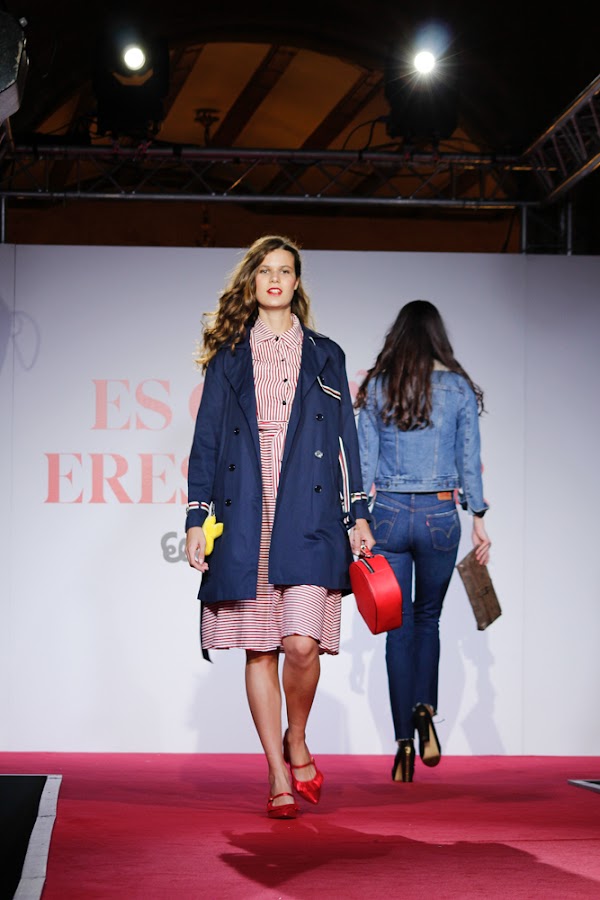 Si tuviera que elegir un solo estilismo de todo el desfile con el cual quedarme (evidentemente, para vestir), sería esta propuesta de Kling que consta de un vestido camisero de rayas con lazada (of course), una gabardina de estilo marinero (sin dudarlo), zapatos de tacón bajo y bolsito de mano de estilo bombonera. Es tan yo que parece ideado por mí.