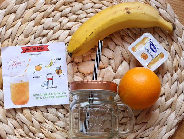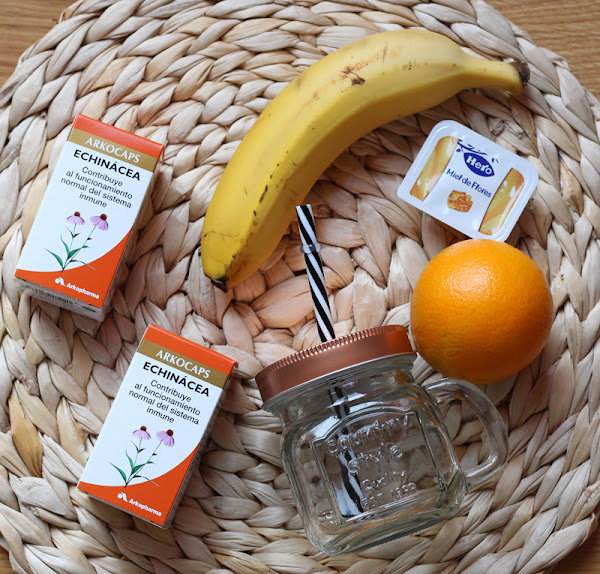 Y este paquete me encantó, contenía dos cajas de Arkocaps Echinácea, perfectas para contribuir al funcionamiento del sistema inmune y así evitar coger enfermedades a menudo, porque que mejor que cuidarse y evitar enfermedades de forma natural y también, los ingredientes para hacernos un smothie super vitamínico a base de plátano, naranja, miel y leche ó yogur, ¡está riquísimo y es buenísimo! (la jarrita donde yo lo preparé no estaba incluida y por si me preguntáis, es de la tienda Casa)