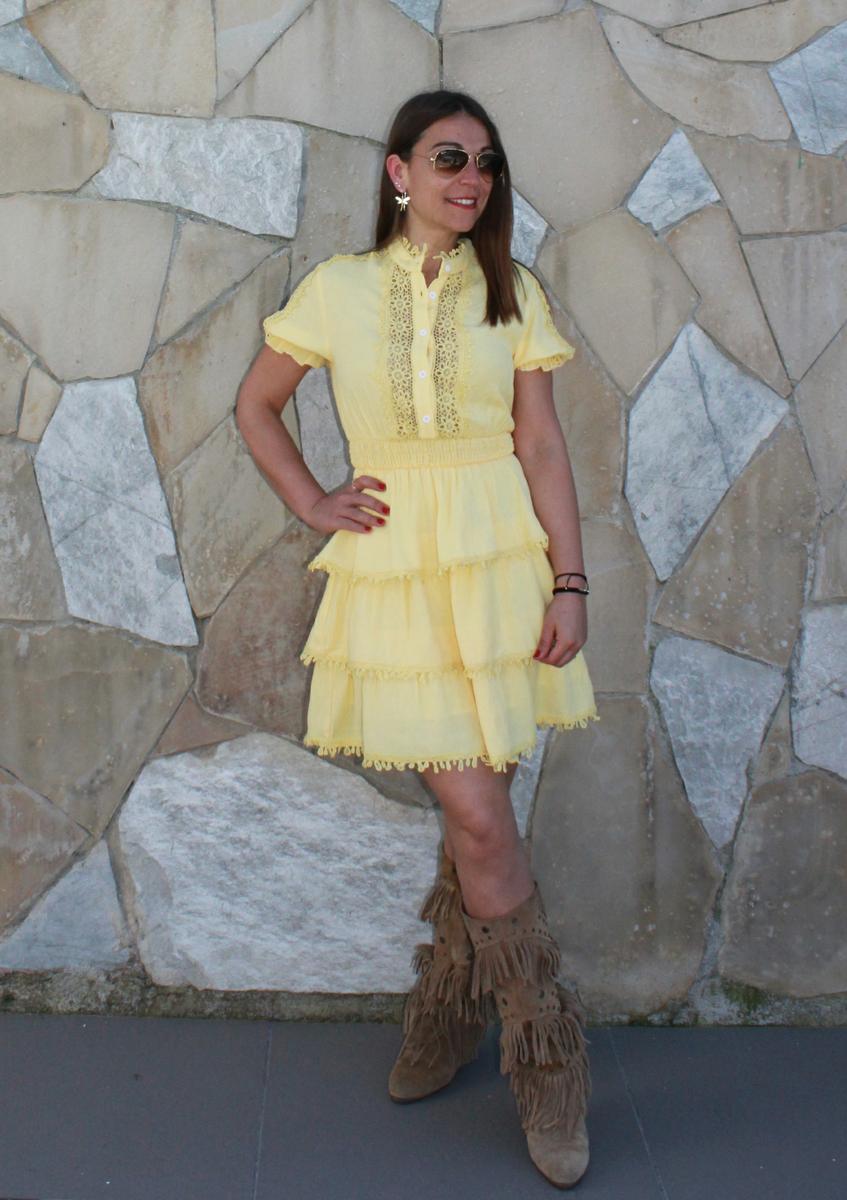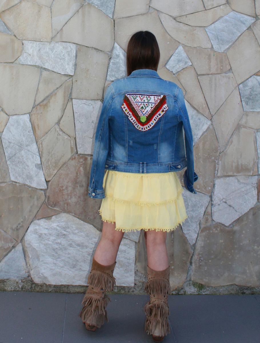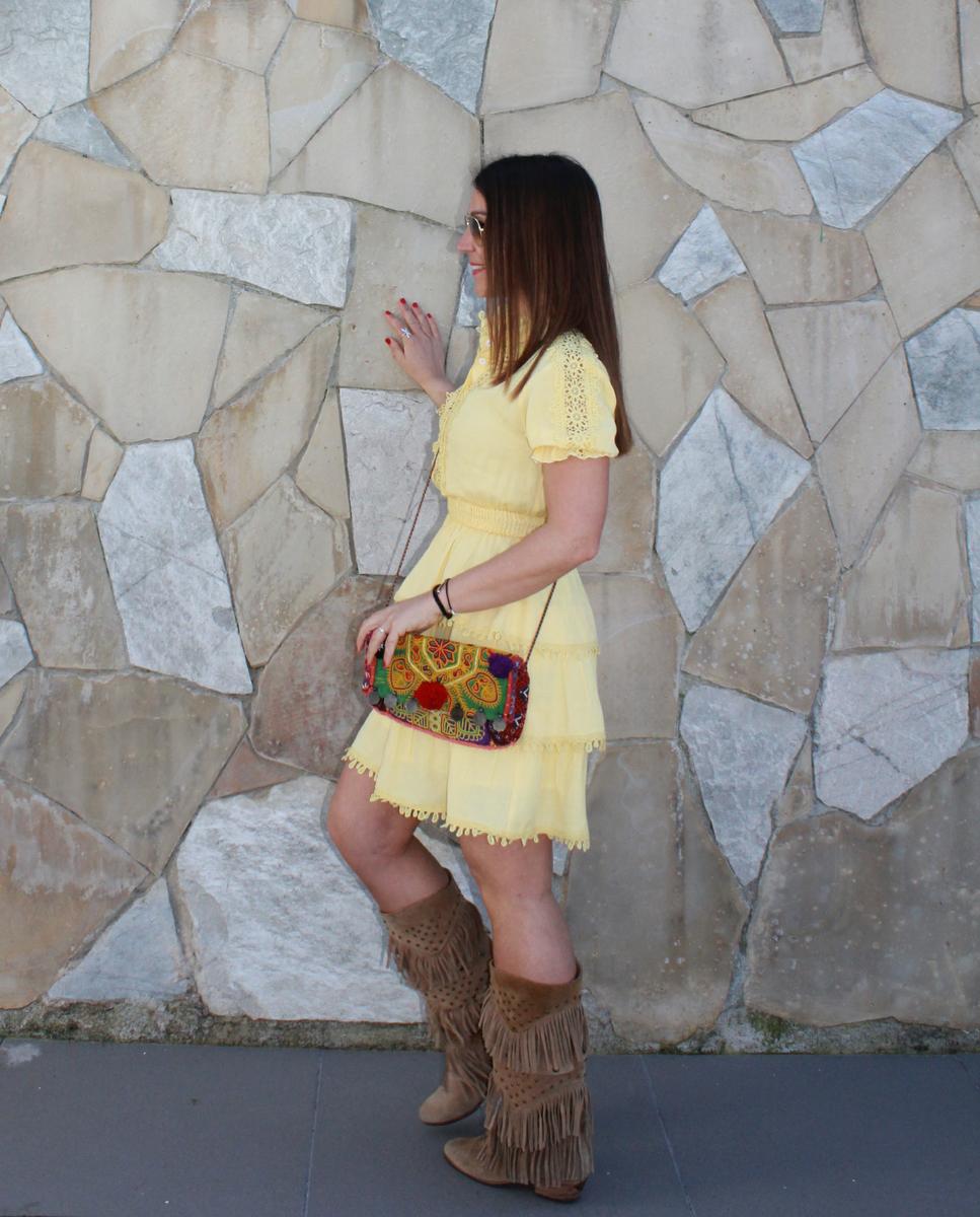 Para recorrer Iquitos elegí un vestido en color amarillo, muy acorde con los colores de la ciudad (así como con el de la Catedral…jajaja),con bonitos volantes en la falda, fruncido a la cintura con goma y crochet en mangas y pechera. Cazadora vaquera con motivos étnicos y botas de flecos.