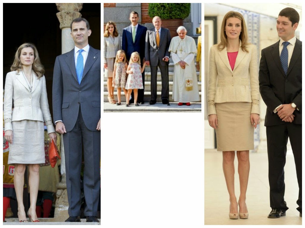 El caso es que doña Letizia ha optado por un correcto y sencillo atuendo en tonos beiges y arena, muy neutros, todo de Felipe Valera, que ya estrenó en Mayo de 2011 en una visita a Navarra, repitió cuando se recibió al entonces Papa Benedicto XVI en la Zarzuela en Agosto del mismo año y tripitió en su visita a Portugal en Mayo de 2012; hoy ha acompañado el atuendo con zapatos de Magrit y bolso de mano de Adolfo Domínguez en tonos acordes.