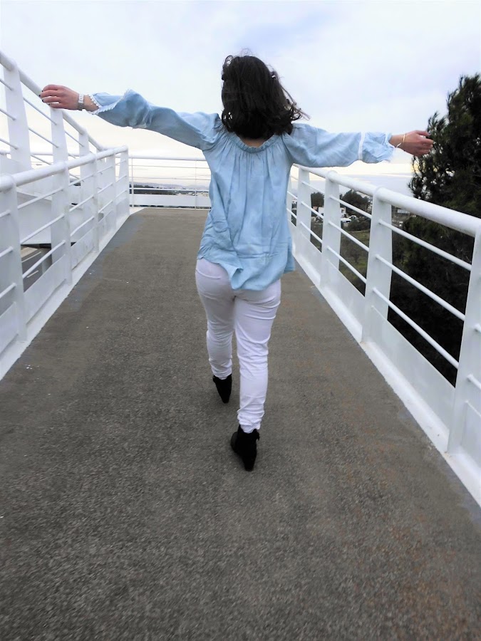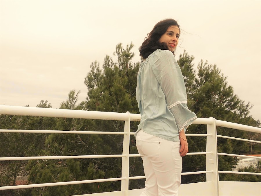 El primero de los looks tiene como protagonista esta delicada blusa (la he buscado y se ha acabado, pero he encontrado una muy parecida en blanco, porque en en azul también se acabó). En cuanto la vi, me enamoró totalmente su color suave, sus mangas anchitas un poco boho y el bordado que tiene cerca de la muñeca. ¿A vosotros también os pasa? Cuando una prenda me encanta, no puedo parar de ponermela, y ésta será una de ellas. Además también me encanta que no se transparenta nada, cuando la cogí pensé que necesitaría alguna camiseta debajo pero no fue necesario. Para ser la primera vez que pido en Internet, acerté bastante con las tallas. Suelen ser las que lleváis habitualmente.