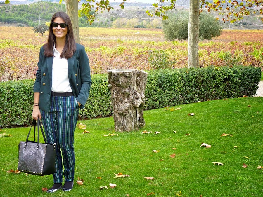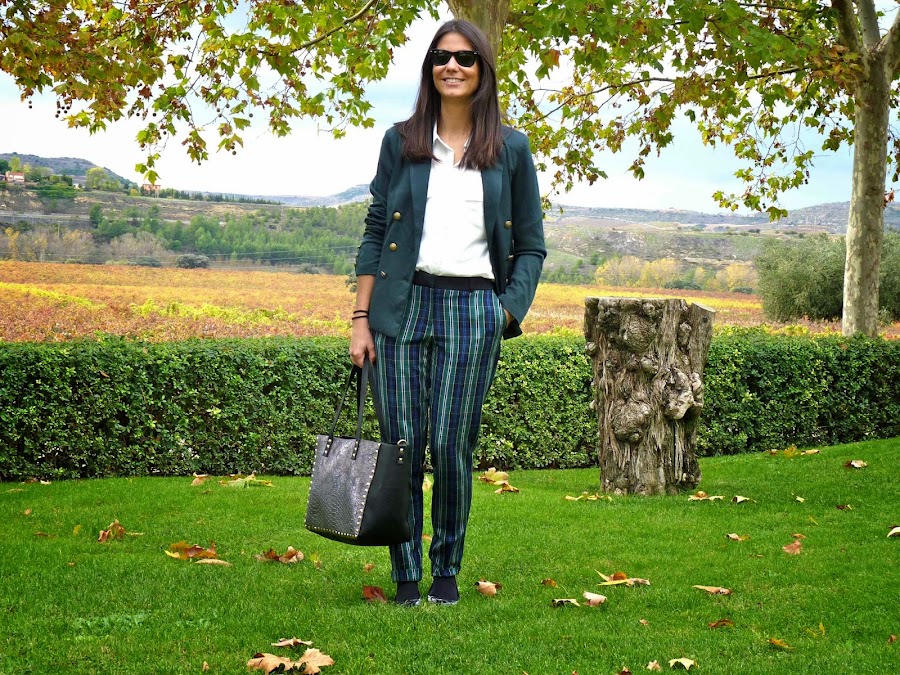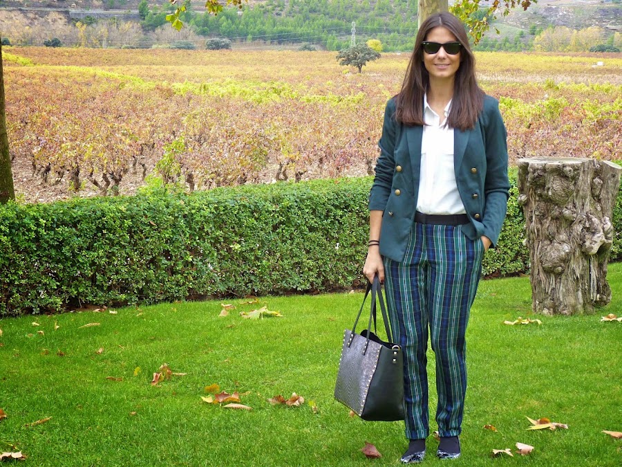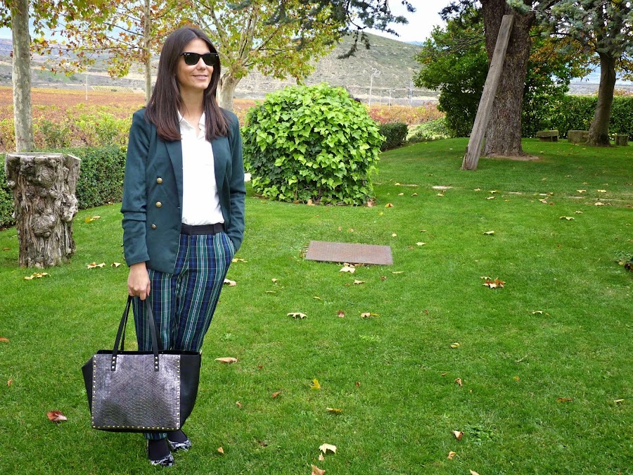 Para la ocasión escogí este total look de Venca. Desde que vi estos pantalones de cuadros en color verde botella supe que tenían que ser para mi. Los combiné con una camisa blanca y una americana también verde con unos botones ideales. Como complementos, unas bailarinas bicolor en negro y playa y un bolso a juego. Os animo a echar un ojo a la web de Venca porque tienen cosas ideales para esta temporada y además con unos precios inmejorables.