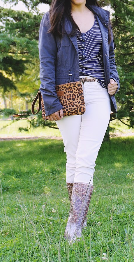 Así nació mi idea de enseñaros una idea de outfit para un día lluvioso combinando varios complementos con print de leopardo. La inspiración es preppy y marinera,y el conjunto se basa en unos pantalones blancos (básicos en cualquier armario preppy), una camiseta a rayas, un chubasquero de buena calidad (es importante tener, al menos, uno), un cinturón fino con print de leopardo, un clucth con print de leopardo, unas botas de agua con print de leopardo, unos calcetines altos y un paraguas transparente.