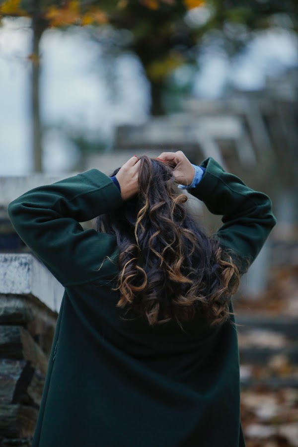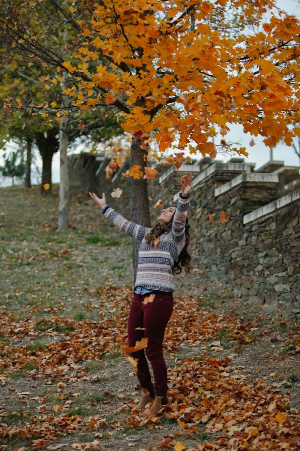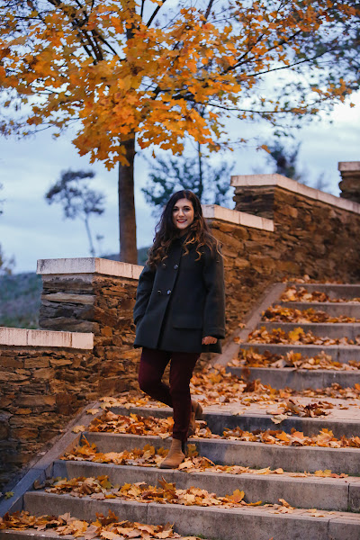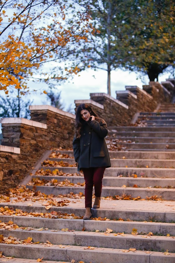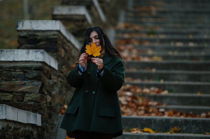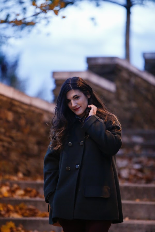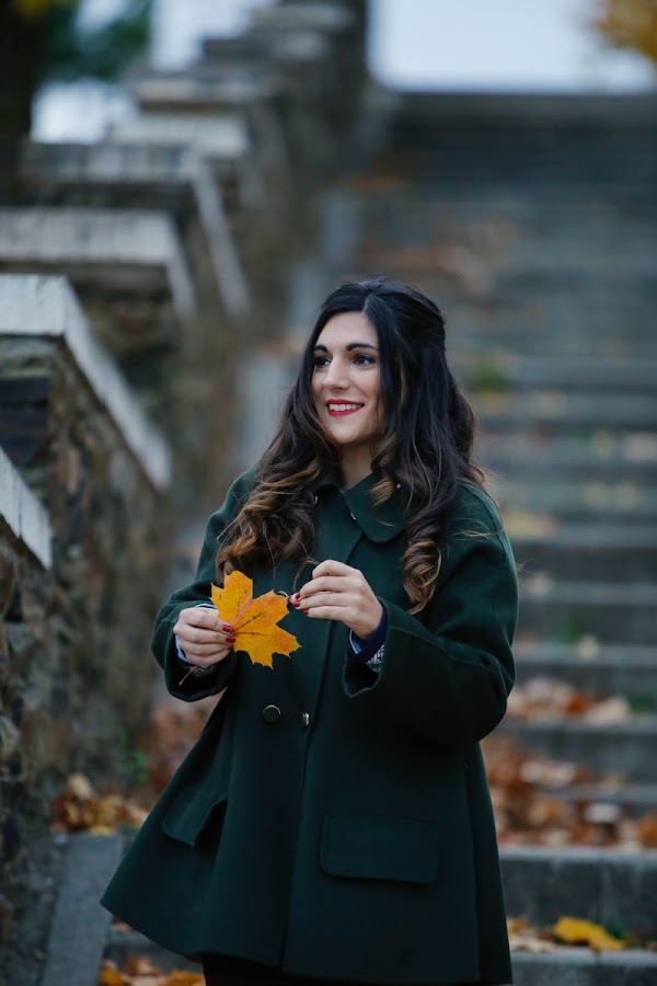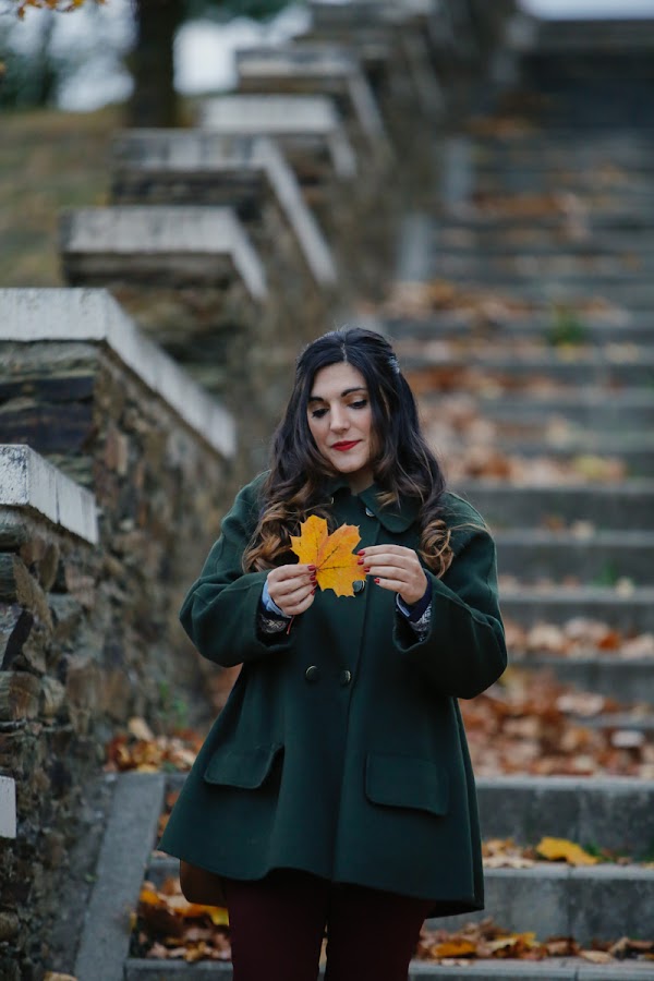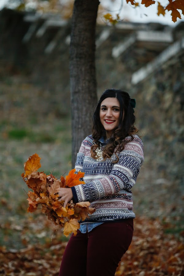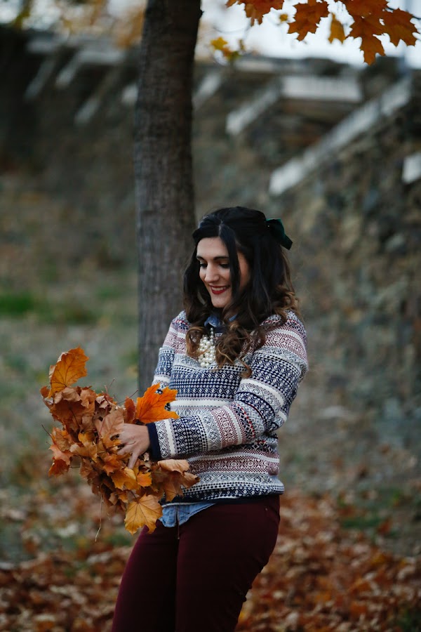 Me di cuenta de que estas fotos, que fueron completamente accidentales (peinado aparte), representan exactamente lo que está pasando con el clima. Estamos ya en diciembre y, sin embargo, los árboles aún siguen cubiertos de hojas que se van cayendo poco a poco. Y yo soy una especie de transición del otoño a Navidad que no termina de florecer.