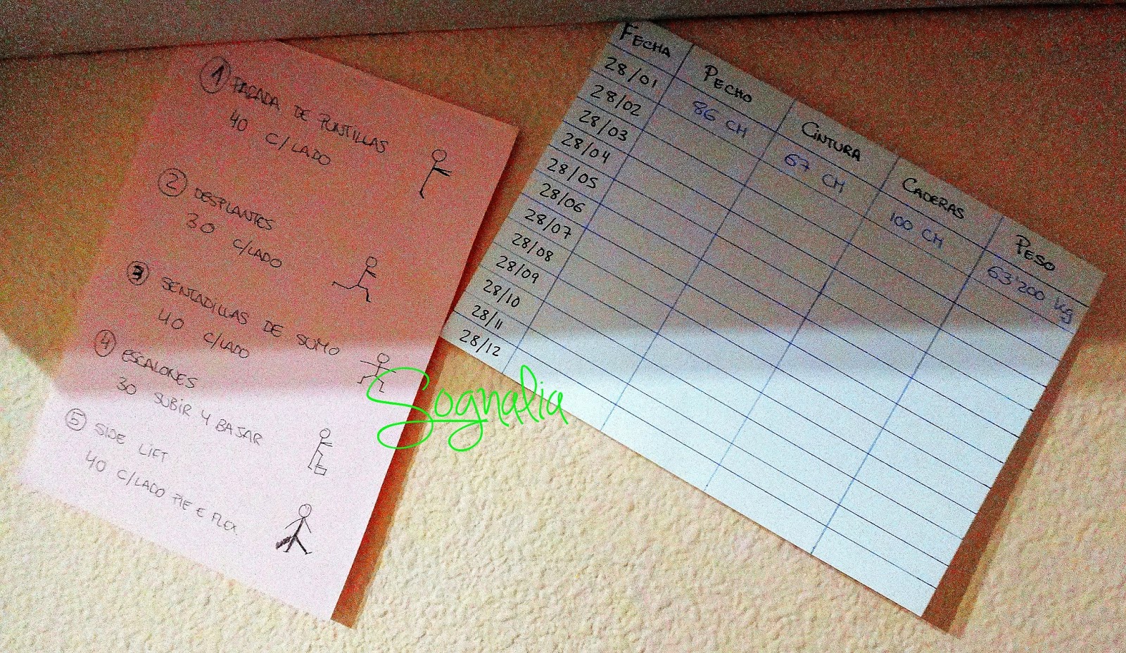 Una forma muy buena de motivarnos es ponerlo en un lugar donde lo tengamos visible, para que no se nos olvide porqué queremos hacer, queremos superarnos a nosotras mismas mes a mes. En mi caso, lo he colocado junto a mis ejercicios diarios, ¡doble motivación!