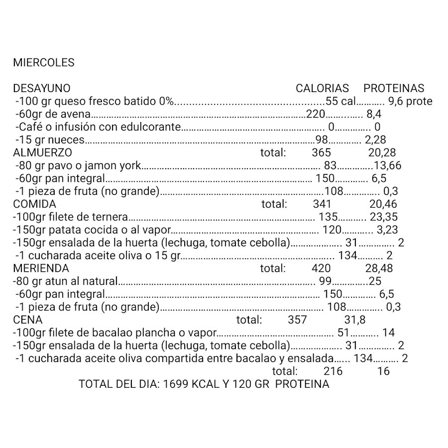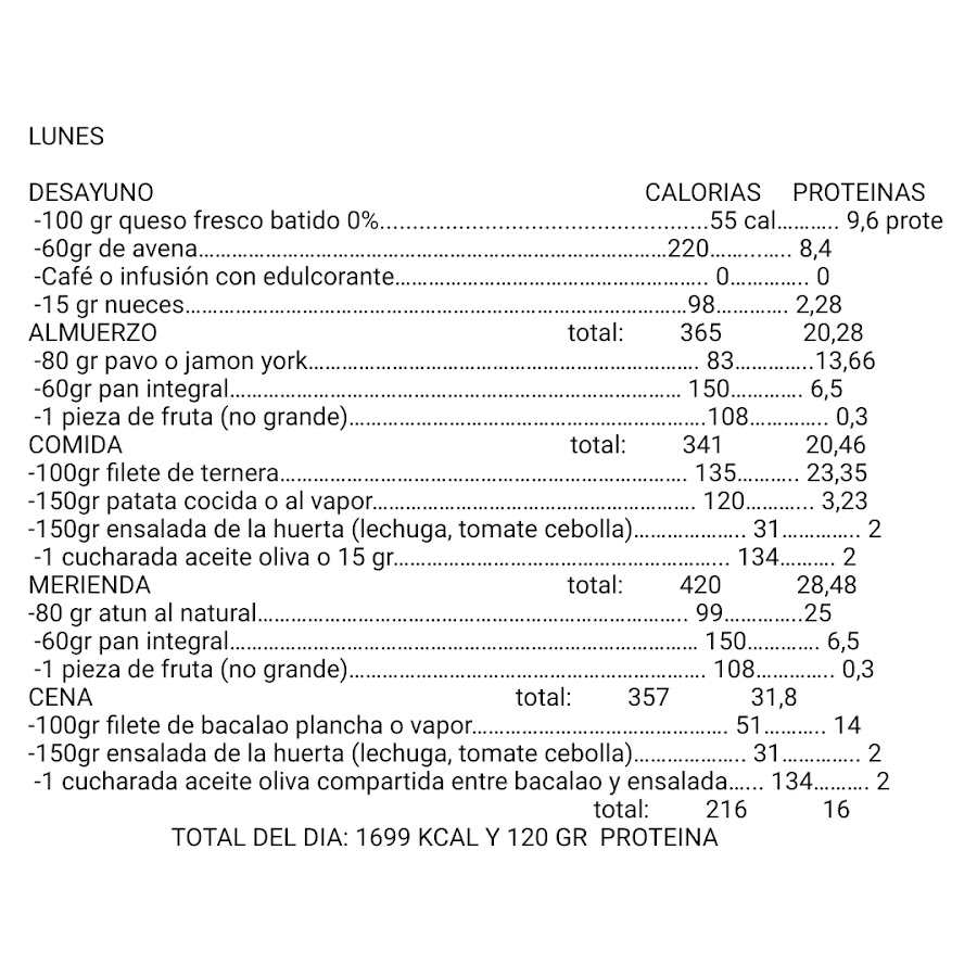 Y anque ultimamente , es muy habitual escuchar: no hace falta controlar calorias, pues ese dato es un arma de doble filo. No deberán contar calorías, personas que tengan bien nociones de nutrición y conozcan composicionalmente los alimentos, o bien, personas que tengan un entrenamiento de alto nivel, además prolongado en el tiempo (su metabolismo está activado). Pero, la realidad me lleva a saber, que la inmensa mayoria de las personas que buscan una dieta standard para llevarla a cabo, no son de estos tipos de personas, con lo cual, para APRENDER, acerca de macros, calorias, proteinas por alimentos, deberán aprender a desglosar y contabilizar todos esos factores, para posteriormente, una vez hayan alcanzado el objetivo, puedan pasar al primer nivel que he comentado, donde ya no haga falta contabilizar porque ya conocerás composiciones y cantidades. En todo debe de haber un aprendizaje, con lo que SI VAMOS A CONTAR CANTIDADES, CALORIAS YPROTEINAS (para mantener masa muscular) en esta dieta.