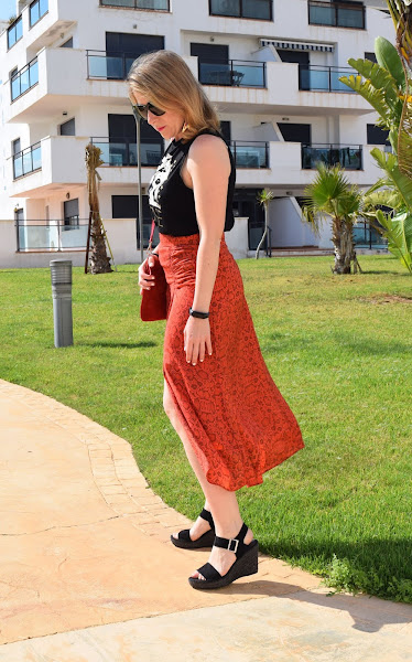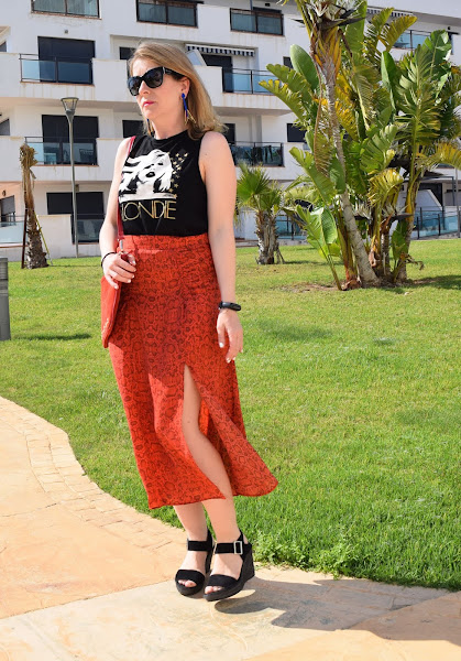 En mi caso.me.gusta combinar esta camiseta de Blondie con faldas midi, como como de estampado serpiente que ya ha salido en el blog.