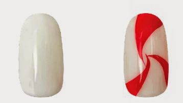 3.-Comenzamos con el diseño de caramelo,visualiza el centro de la uña y partiendo de ese punto intercala 3 franjas curvas,emplea esmalte coral oscuro o rojo