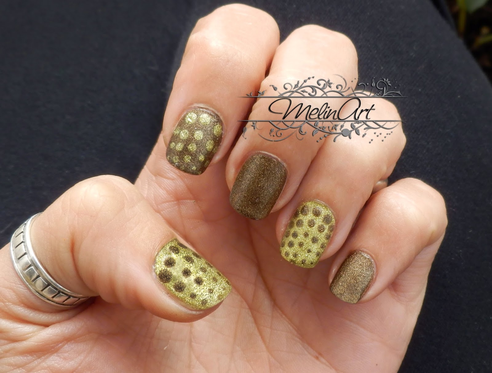 El acabado es satinado, mate en el color de fondo del esmalte pero tiene unas partículas doradas que se quedan semi brillantes. El efecto me encantó así que he usado un marrón y un verde lima con chispas doradas.