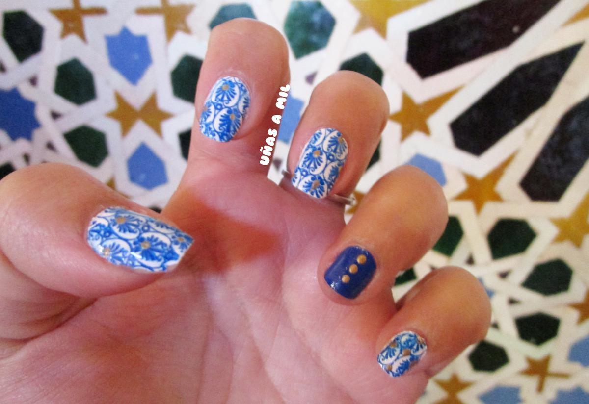 Hoy os voy a enseñar cómo he hecho el diseño de uñas estilo azulejonazarí / marroquí o árabe (desconozco como se denomina en otros países…), escogí en tonos azul y blanco con un toque de dorado.