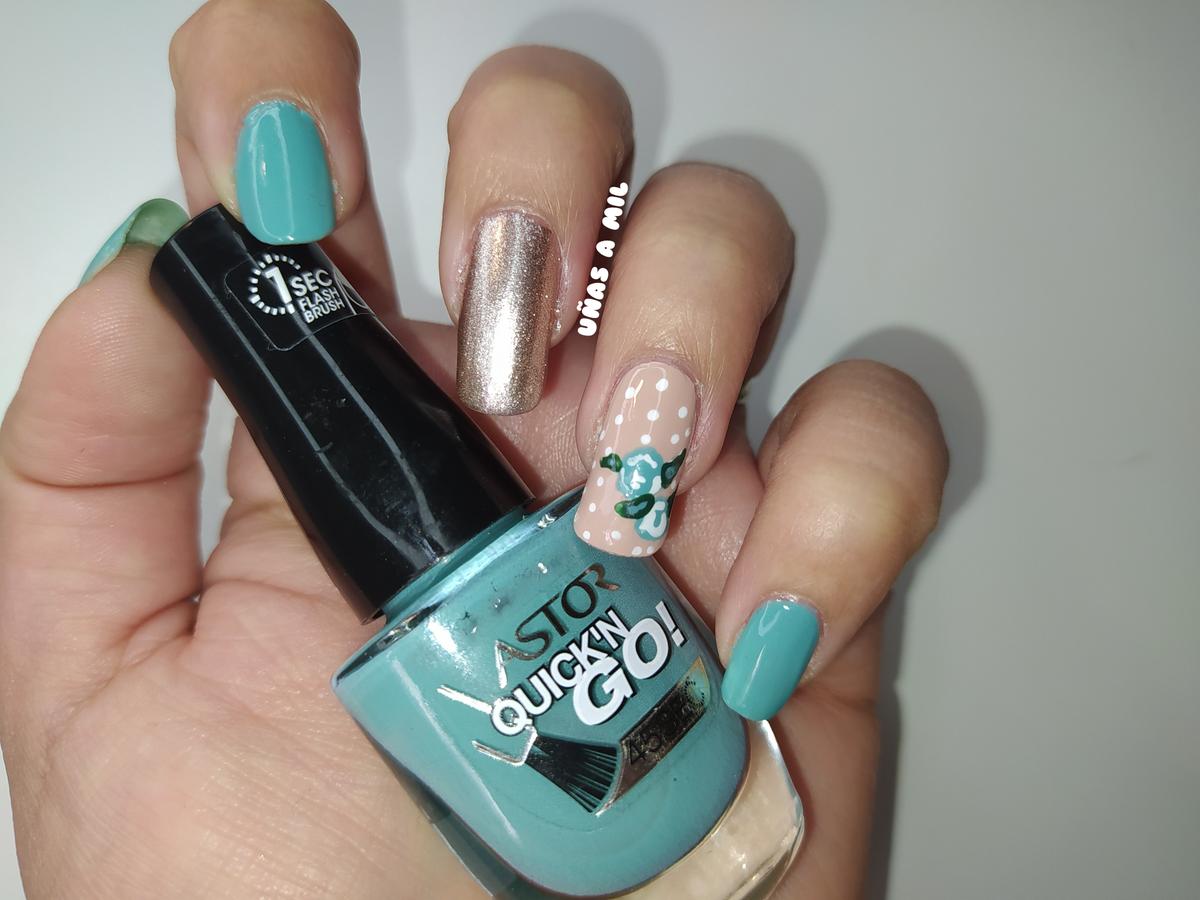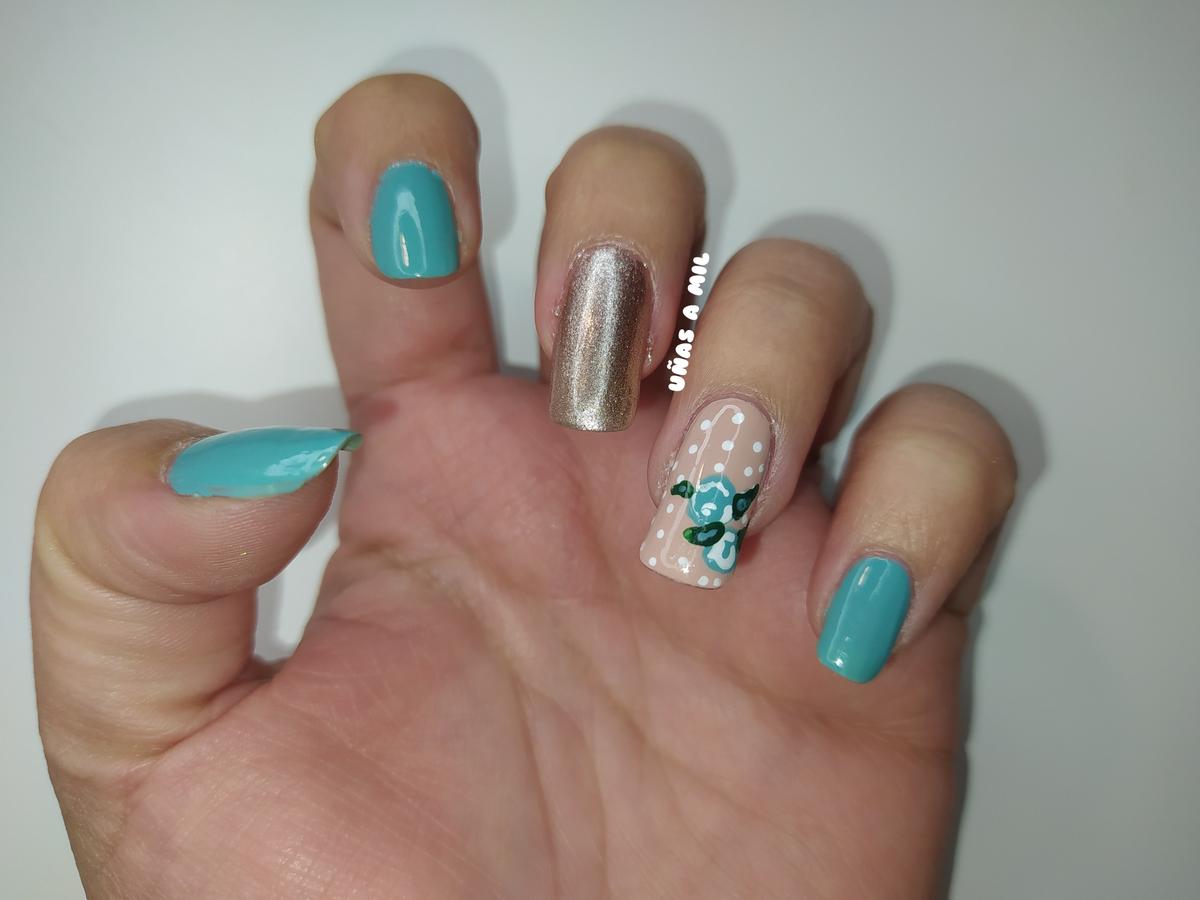 En la uña del dedo anular, he hecho unas flores con la ayuda de un dooting tool, con el que también he hecho los lunares blancos.